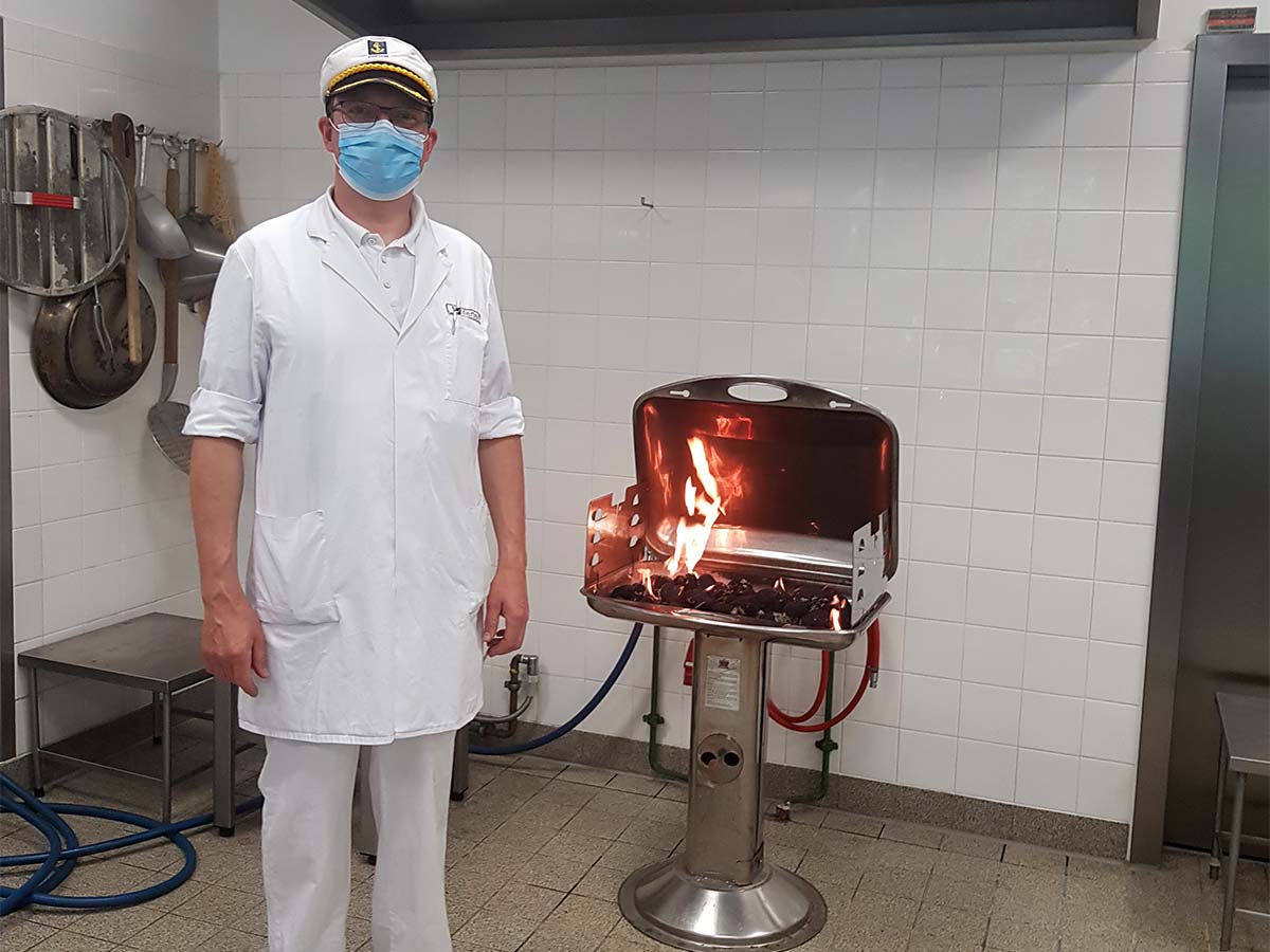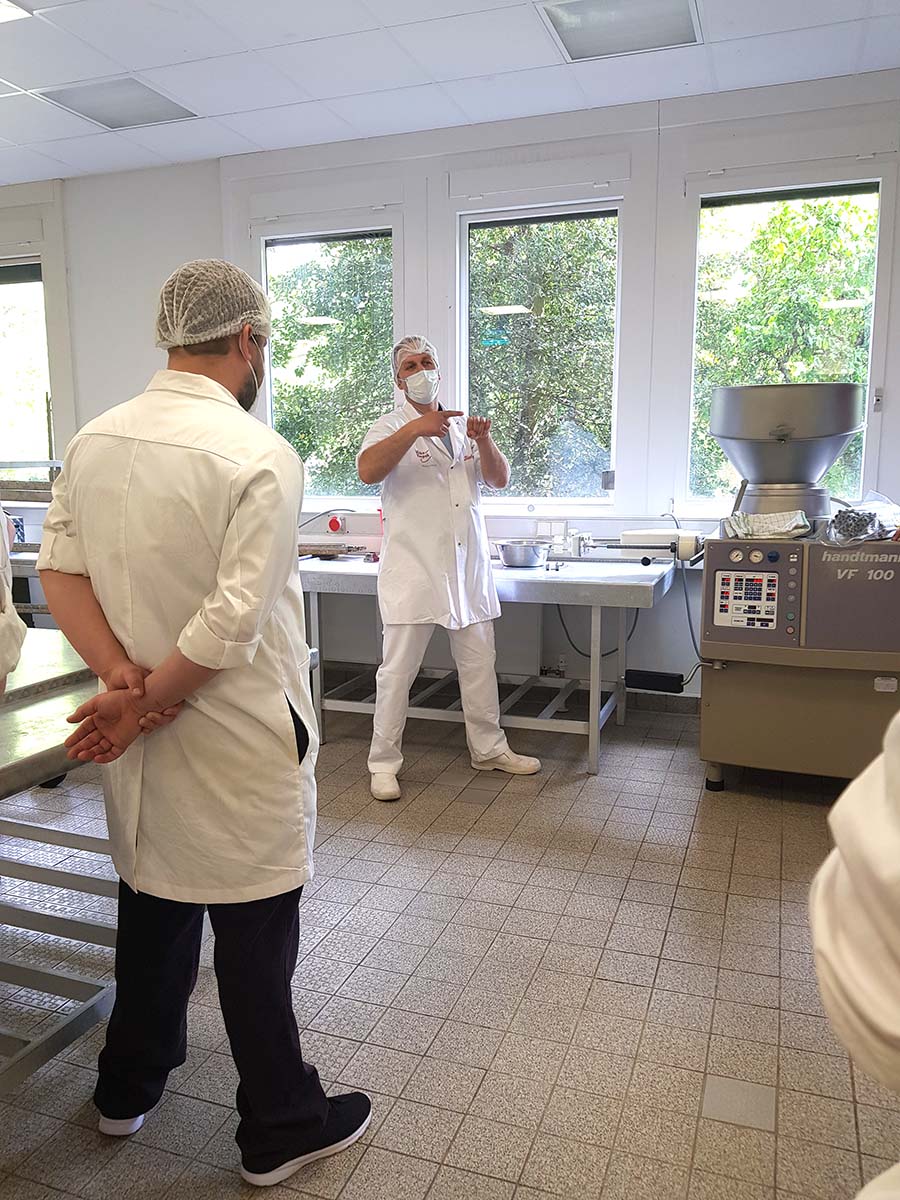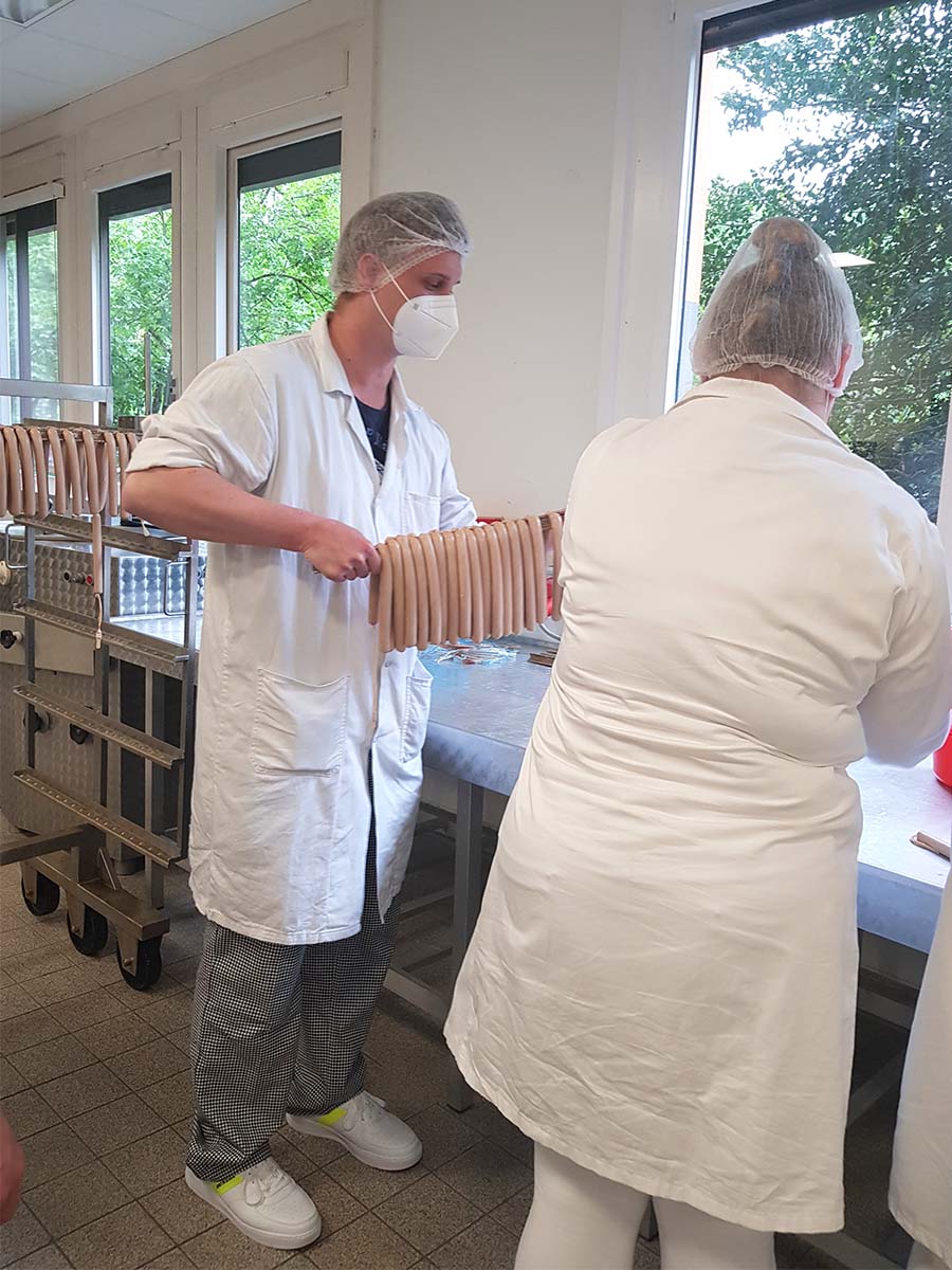 Anschließend wurde das erlernte Wissen in unserem hauseigenen Fleisch-Technikum bei einer praktischen Vorführung umgesetzt und die Studierenden konnten mit Hand anlegen. Produziert wurden eine leckere grobe Bratwurst und eine Wiener Wurst in verschiedenen Därmen. Die anschließende Verkostung der produzierten Produkte musste aufgrund des Wetters kurzfristig nach drinnen verlegt werden, was der Stimmung aber nicht geschadet hat.