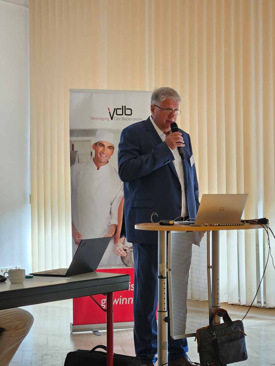 Als Einstieg erklärte Kevin Gliestau von der Gewerkschaft NGG die derzeitige Situation im Backgewerbe. Er beklagte den starken Rückgang in der Branche von 20000 Mitarbeitenden verbunden mit neuen Herausforderungen durch zunehmende Arbeitskräfte mit migrantischem Hintergrund. „Dies alles ohne flächendeckende Tarifvertäge“. Die NGG ist an einer Aufrechterhaltung der handwerklichen Struktur der Backbranche interessiert und anerkennt die branchentypischen Besonderheiten des Gewerbes.