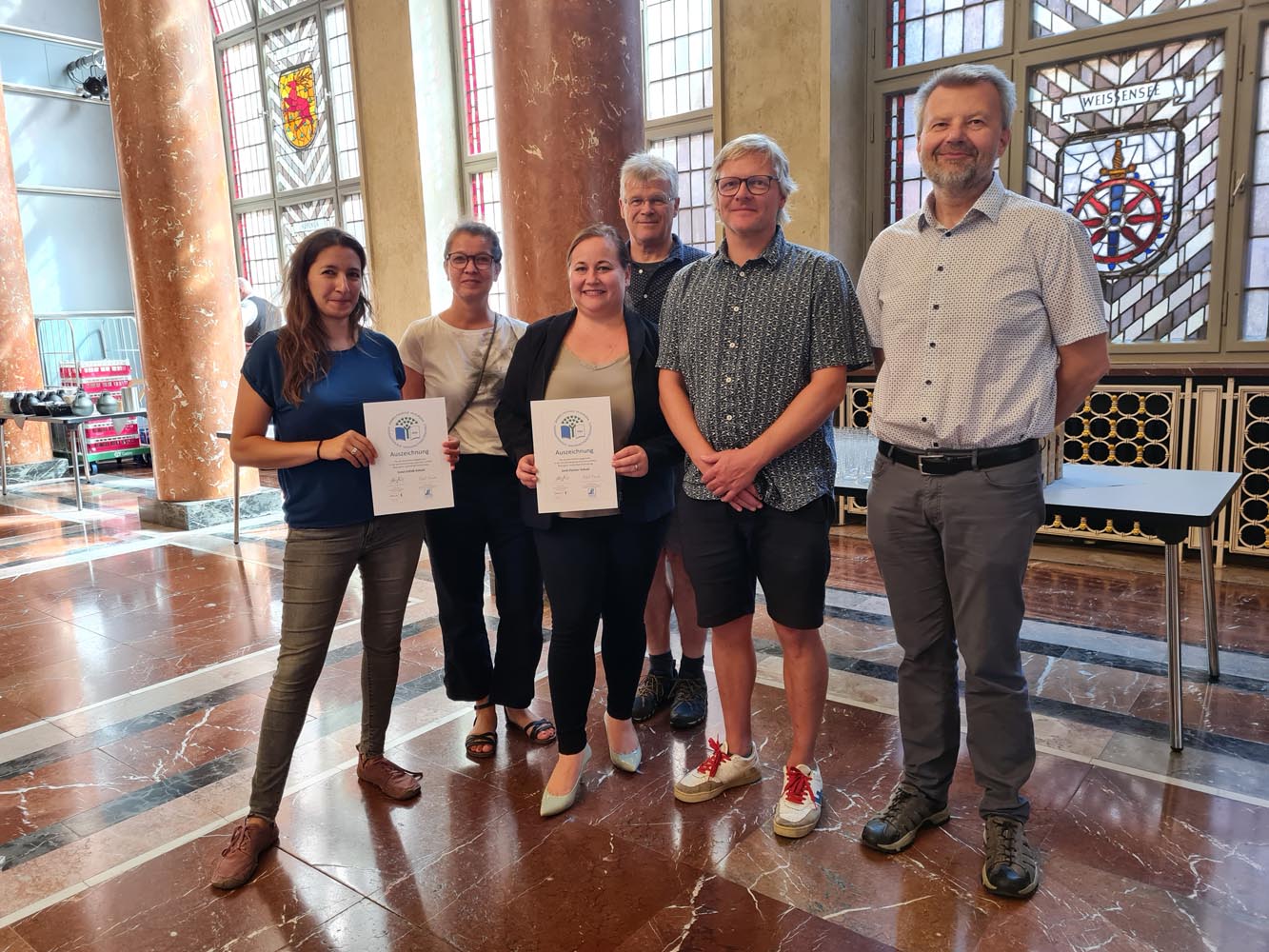 Am 6. September war es soweit: Clivia Offermann (stellv. Schulleiterin) und Miriam Bittar von der Ernst-Litfaß-Schule und Robert Baal (stellv. Schulleiter), Stefan Luck und Judith Vogel-Wentzeck (Umweltbeauftragte) von der Emil-Fischer-Schule, sowie Bernd Niemeyer (Technischer Leiter) durften an der Preisverleihung der Internationalen Umweltschulen im Roten Rathaus teilnehmen. Neben 63 anderen Schulen haben wir eine Auszeichnung als Internationale Nachhaltigkeitsschule 2023 erhalten.