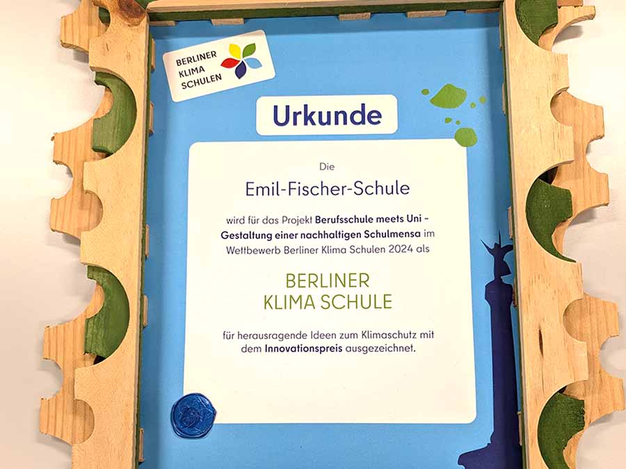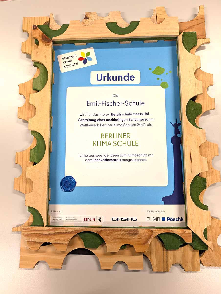 Die Auszeichnung der Berliner Klima Schule findet in Zusammenarbeit der GASAG, der Senatsverwaltung für Bildung Jugend und Familie und der Senatsverwaltung für Mobilität, Verkehr, Klimaschutz und Umwelt statt. Für die Auszeichnung hat die Emil-Fischer-Schule drei verschieden Projekte ins Rennen geschickt. Zwei wurden hierbei von der Jury zu einem Innovationspreis zusammengefasst. Damit sind wir dieses Jahr eine von zwölf Schulen Berlinweit, welche ausgezeichnet wurden und ein Preisgeld von 500 Euro erhalten um damit ein nachhaltiges Schulprojekt zu unterstützen. Bei dem Antrag für die Berliner Klima Schule ging es vor allem um die Projekte „Berufsschule meet’s Uni“ in Kooperation mit der FU Berlin und dem erst im aktuell laufenden Schuljahr angelaufenen Projekt „fit for circular“ von Circular Berlin. (Homepagebericht hierzu folgt noch nach der Halbzeit des Projektes). Vor allem hervorgehoben von der Jury wurde unsere große Bereitschaft mit Kooperationspartnern zusammen zu arbeiten. Auch wir empfinden diese Möglichkeit als sehr bereichernd für unsere Schule und unterstützen daher gerne Projekte mit außerschulischen Partnern. Pressemitteilung Berliner Klima Schule Siegerschulen