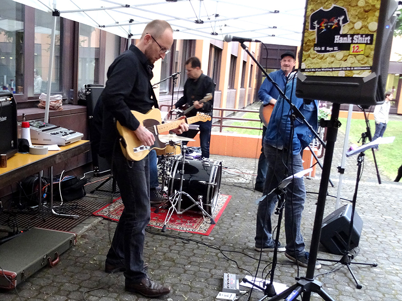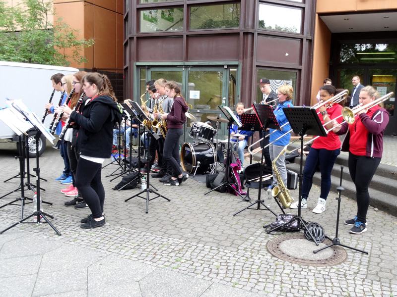 Das zweite Highlight des Fests boten The Franklins, die Big Band der Benjamin-Franklin-Schule. Big war nicht nur die Größe der Band unserer Partnerschule und deren Equipment, sondern auch der Sound von Bläsern, Bass und Drums. Mit der James-Bond-Filmmusik und weiteren Titeln wurde die nun anwachsende Gästeschar begrüßt.