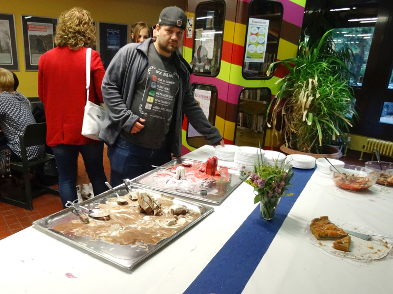 Das köstliche Salat-Büffet wurde vom Publikum gnadenlos und in kurzer Zeit abgeräumt und ein ähnliches Schicksal ereilte wenig später auch die leckeren Hanf-Spezialitäten, Obstsalate und Kuchen, das eigens gebraute vegane Festbier und die Tafel mit dem Eisdessert.