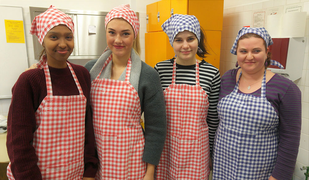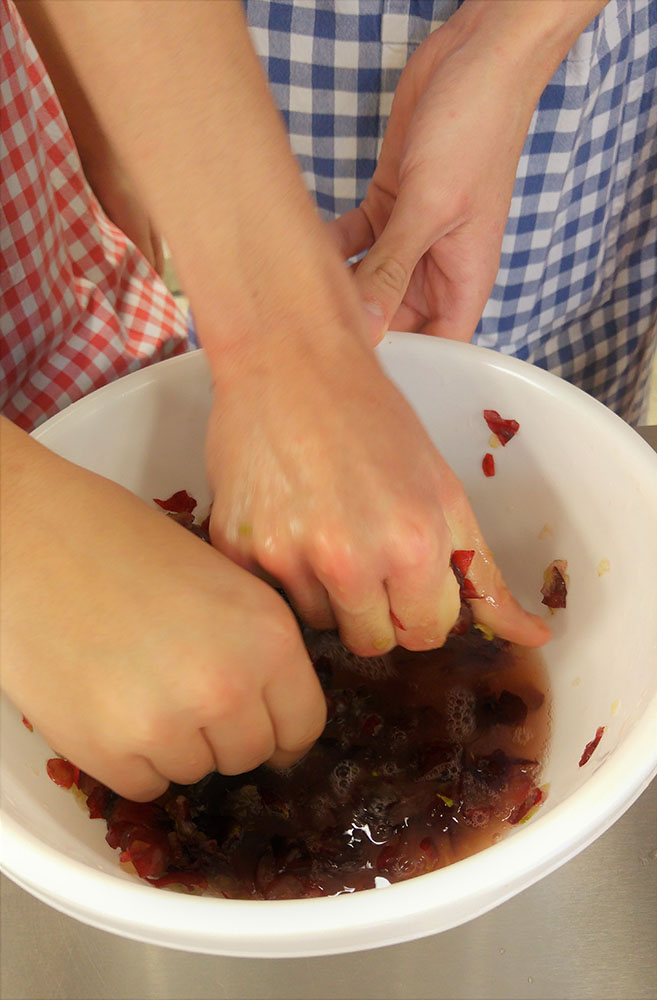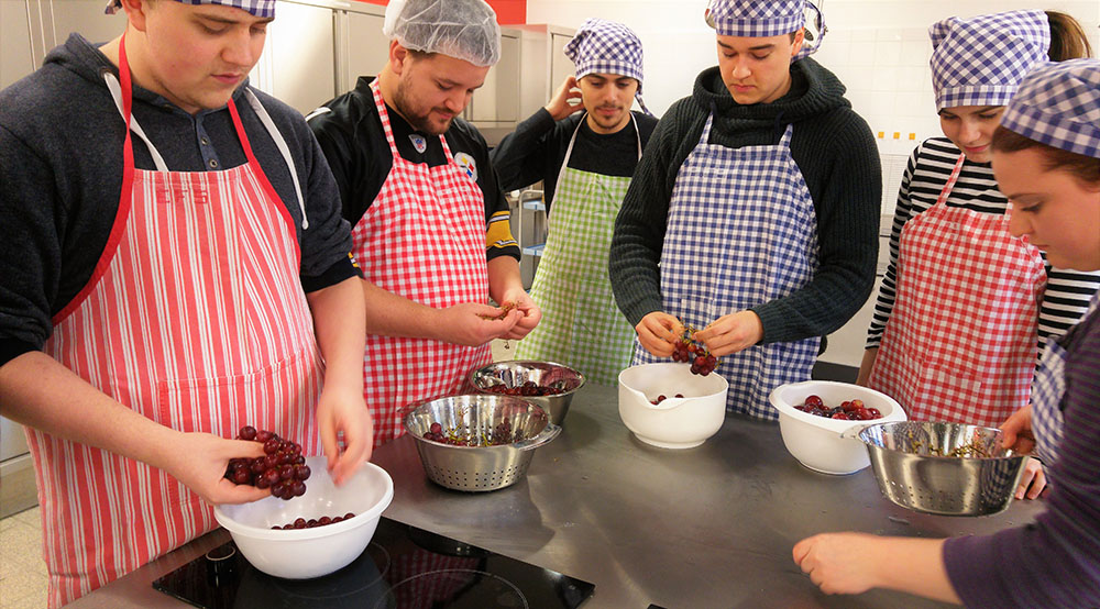 Die Schülerinnen und Schüler der BCT 5.1 beim Waschen und Zerkleinern der roten Trauben.