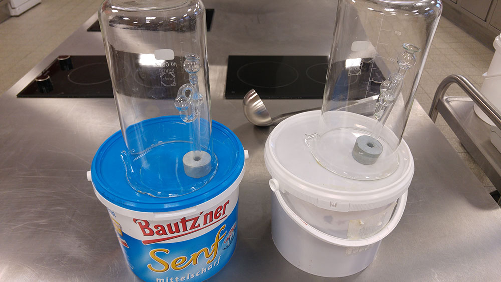 In unserem einfachen Gärbehälter wandelt die zugegebene Weinhefe den Zucker in Alkohol um.