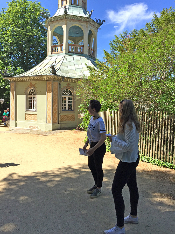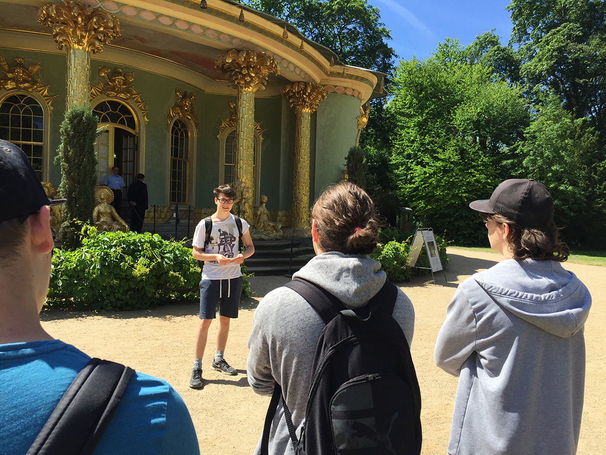 Doch erwartete sie dort keine Standardführung, wie sie Tausende von Touristen jährlich bekommen. Stattdessen wurden die Schüler/-innen selbst zu Expert(inn)en, die ihre Mitreisenden über das Schloss, den Park und seine vielen Sehenswürdigkeiten informierten.