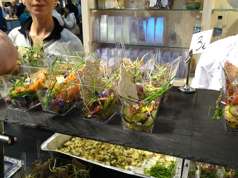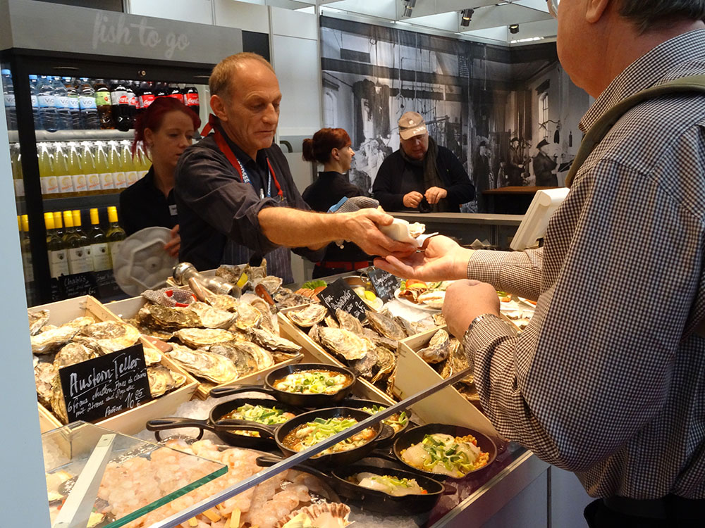 Für die Speisenfolge musste jeder selbst sorgen, sie ergab sich oft zufällig aus der Anordnung der Länder auf dem Rundweg durch die Hallen. Nach Pasteis de Nata aus Portugal folgten z. B. französischen Austern, dann eine schwäbische Maultäschlesuppe und anschließend illustre Lachs- und Knäckebrotsnacks aus Norwegen.