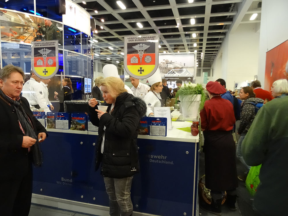 In der „Bio-Halle“ wurde man erstaunlicherweise vom Verpflegungsamt der Bundeswehr begrüßt und zum Eintopf als Marschverpflegung eingeladen. Viele Besucher ließen sich davon aber nicht aufhalten und steuerten zielgerichtet gleich einen der zahlreichen Bier-, Wein- oder Schnapsstände in der Umgebung an.