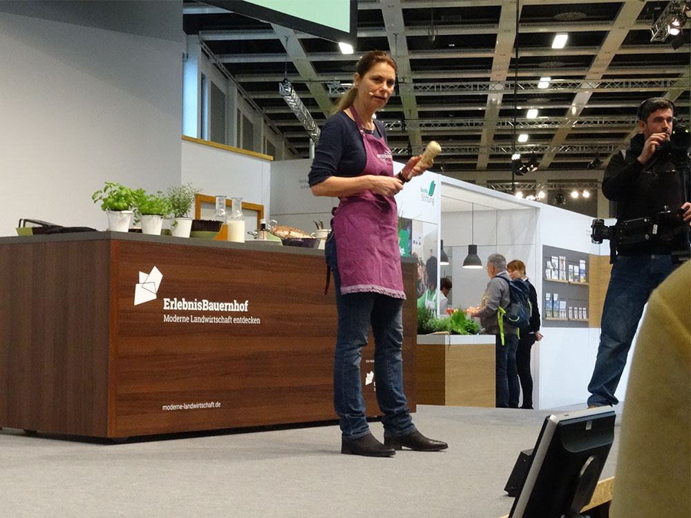 Auf dem „Erlebnis-Bauernhof“ konnten weitere praxisrelevante Kenntnisse von Sarah Wiener erworben werden. Sie verschreckte zwar das Publikum zunächst mit der Frage „Wer von Ihnen kann kochen?“, als sich dann aber niemand traute, so etwas zuzugeben, erklärte sie dennoch, wie man mehligkochende Kartoffeln von festkochenden unterscheidet, Petersilienwurzeln von Pastinaken, und wie man daraus eine Suppe zubereitet.