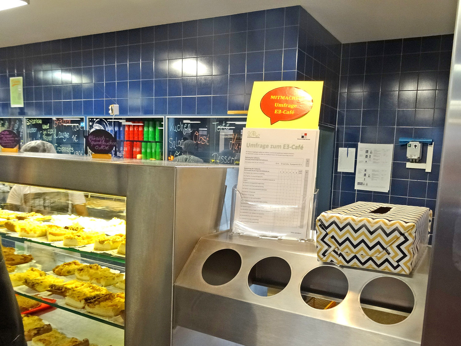 Die Cafeteria, die im Februar 2018 auf den Namen EƎ-Café getauft wurde (Bericht), bietet zwischen 9 und 13 Uhr neben verschiedenen Getränken ein umfangreiches Sortiment von Speisen an. Das Angebot wird von durchschnittlich 250 Kunden pro Tag genutzt und trägt damit erheblich zur Pausen- und Mittagsverpflegung an der Emil-Fischer-Schule und der Ernst-Litfaß-Schule bei.
