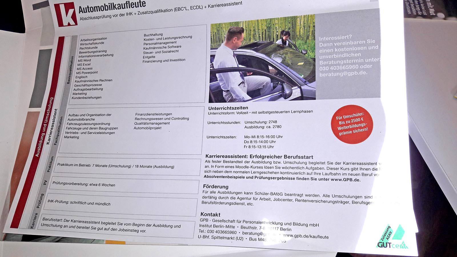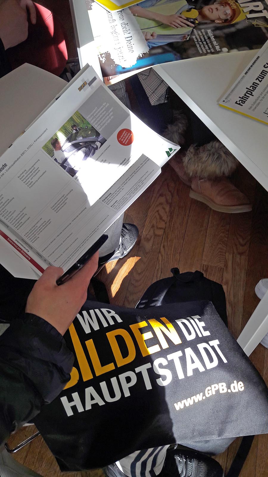 Obwohl die BVG an diesem Freitag streikte, waren viele Schüler/-innen aus beiden Klassen anwesend und konnten z. B. positive Rückmeldungen für ein Praktikum bei der Polizei und in einem Hotel mitnehmen oder Ansprechpartner und Adressen für einen Beruf als Automobilverkäufer gewinnen. Zwei Schülerinnen haben sich zunächst bei den Schulen für Sozialassistenz und Erzieherausbildung informiert und schwärmten am Ende von einer Ausbildung als Gestalterin für visuelles Marketing.