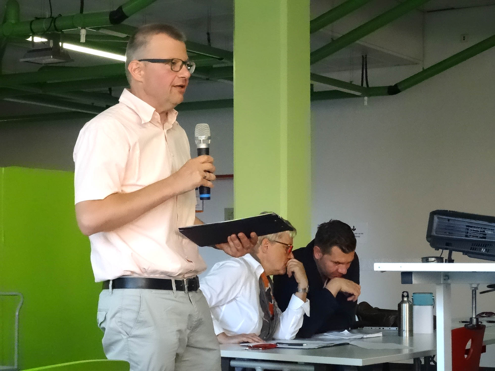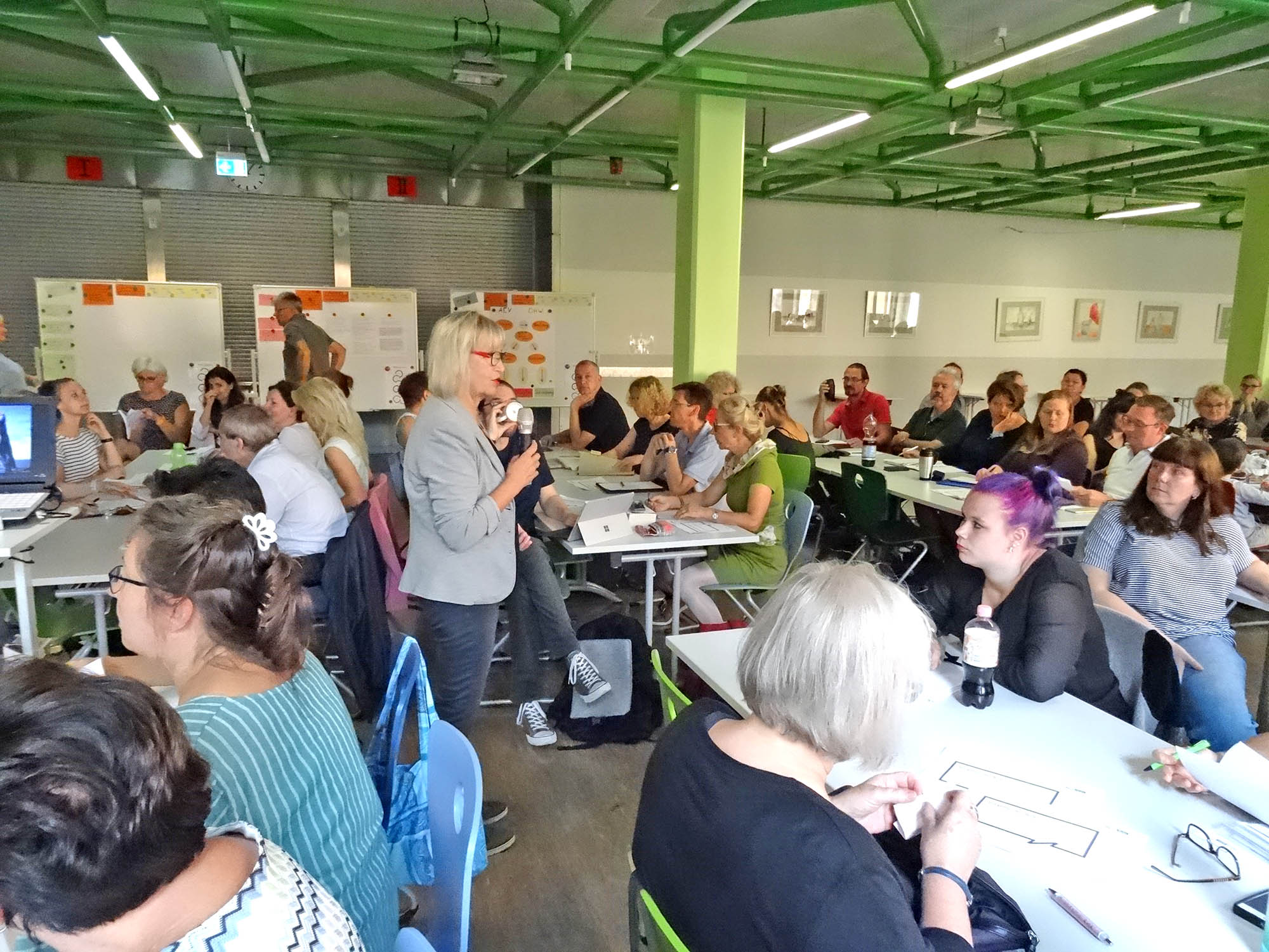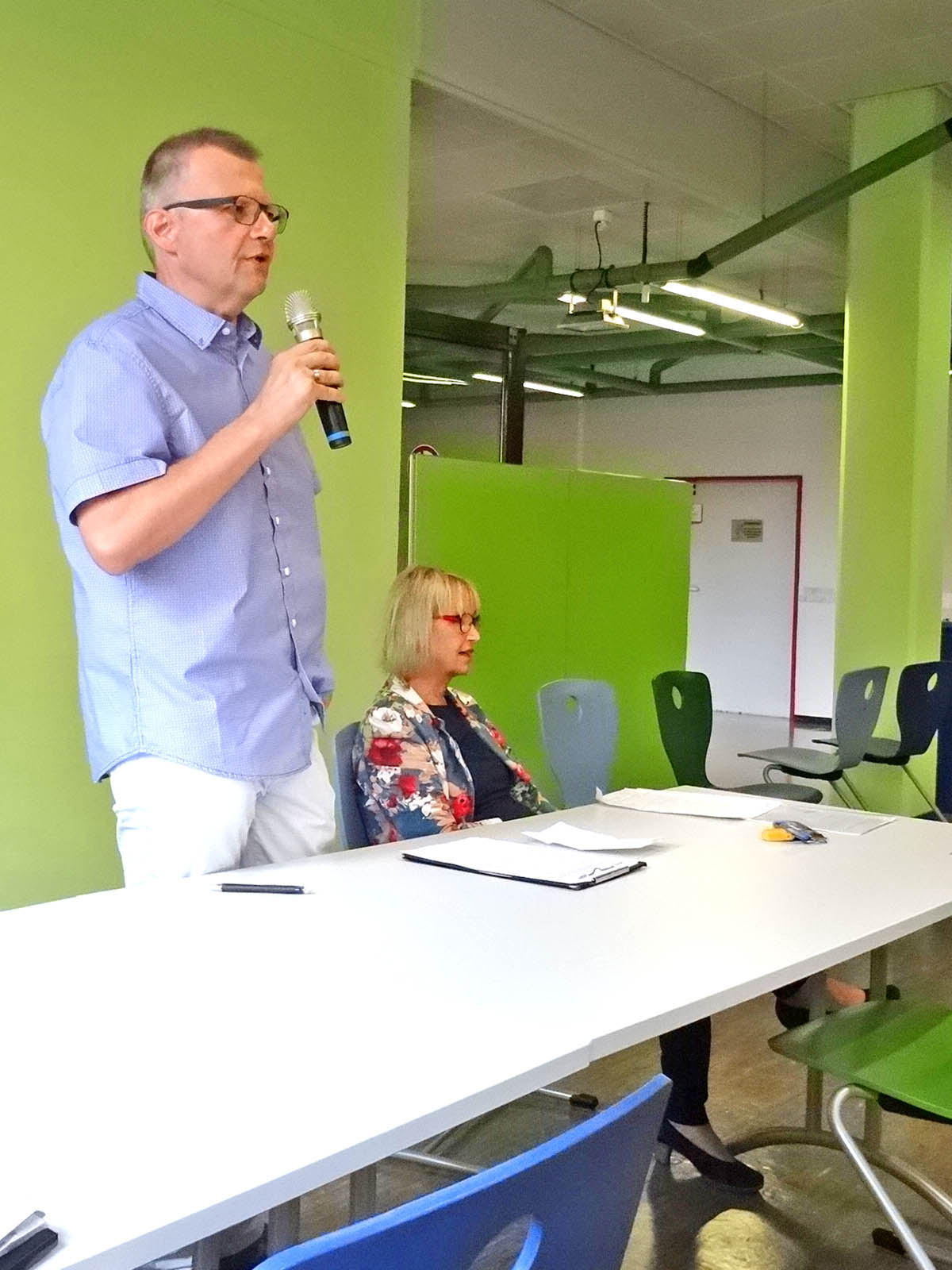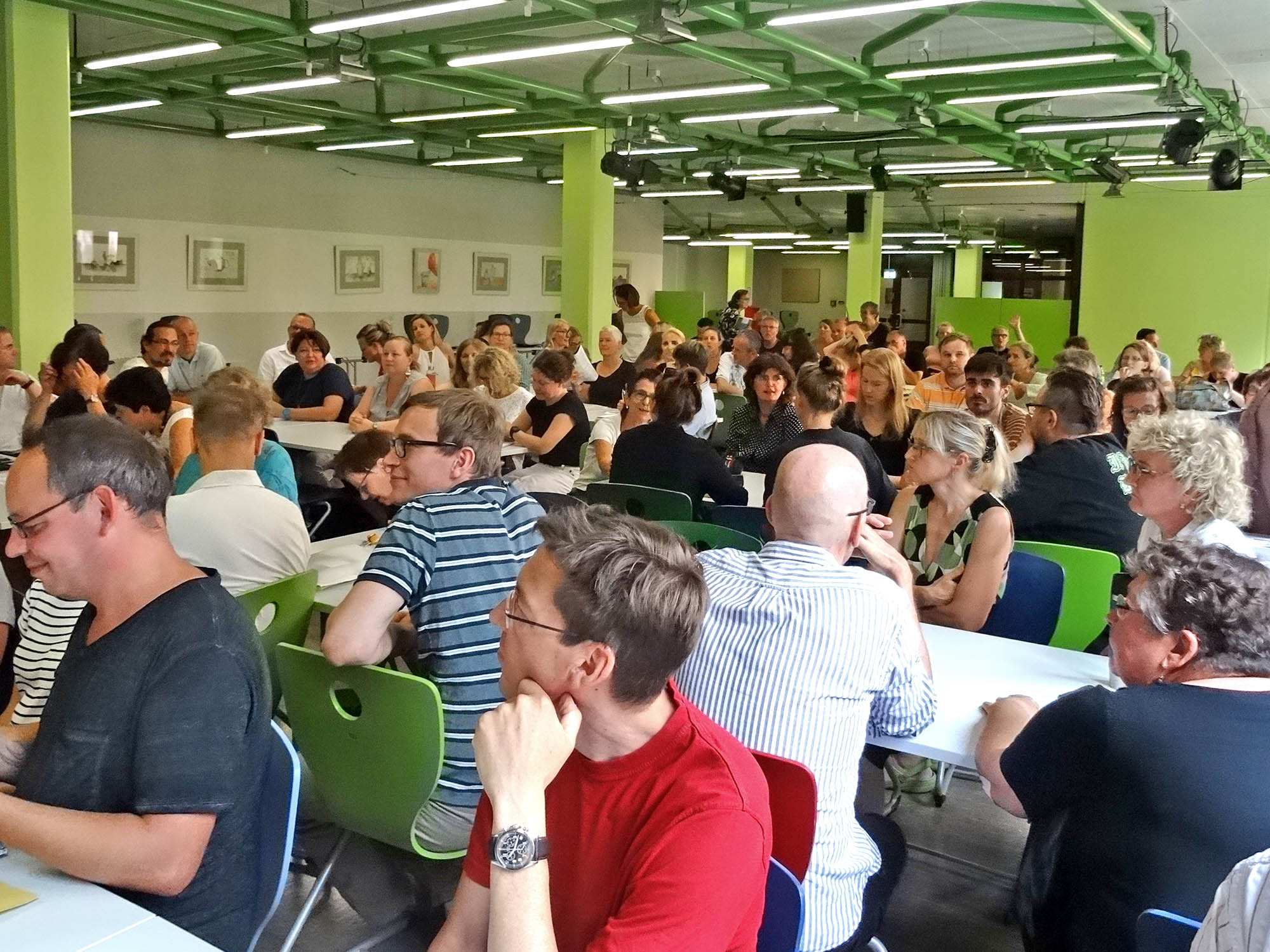 Es folgten Berichte aus den vorangegangenen Bildungsgangkonferenzen zu den Themen Medien- und Sprachbildung sowie Individualisierung von Lernprozessen. Die zahlreich entwickelten Projektideen und Vorschläge (u. a. ‘Glossarbellen’, Explainities, eine ‘Meatmaker-App’, Selbstbewertungsraster...), sollen im Lauf der nächsten fünf Jahre modellhaft erprobt und ggf. in den Regelunterricht übernommen werden. Damit eine Umsetzung gelingen kann, dies wurde in mehreren Beiträgen hervorgehoben, ist eine deutliche Verbesserung der technischen Ausstattung der Schule mit leistungsfähigen PCs, Laptops und Medientechnik erforderlich, außerdem die Einrichtung eines flächendeckenden WLANs sowie eine wesentlich schnellere Internetanbindung. Zugleich äußerten viele Kolleg(inn)en ihre Bereitschaft, die eigene Medienkompetenz durch Fortbildung zu verbessern.
