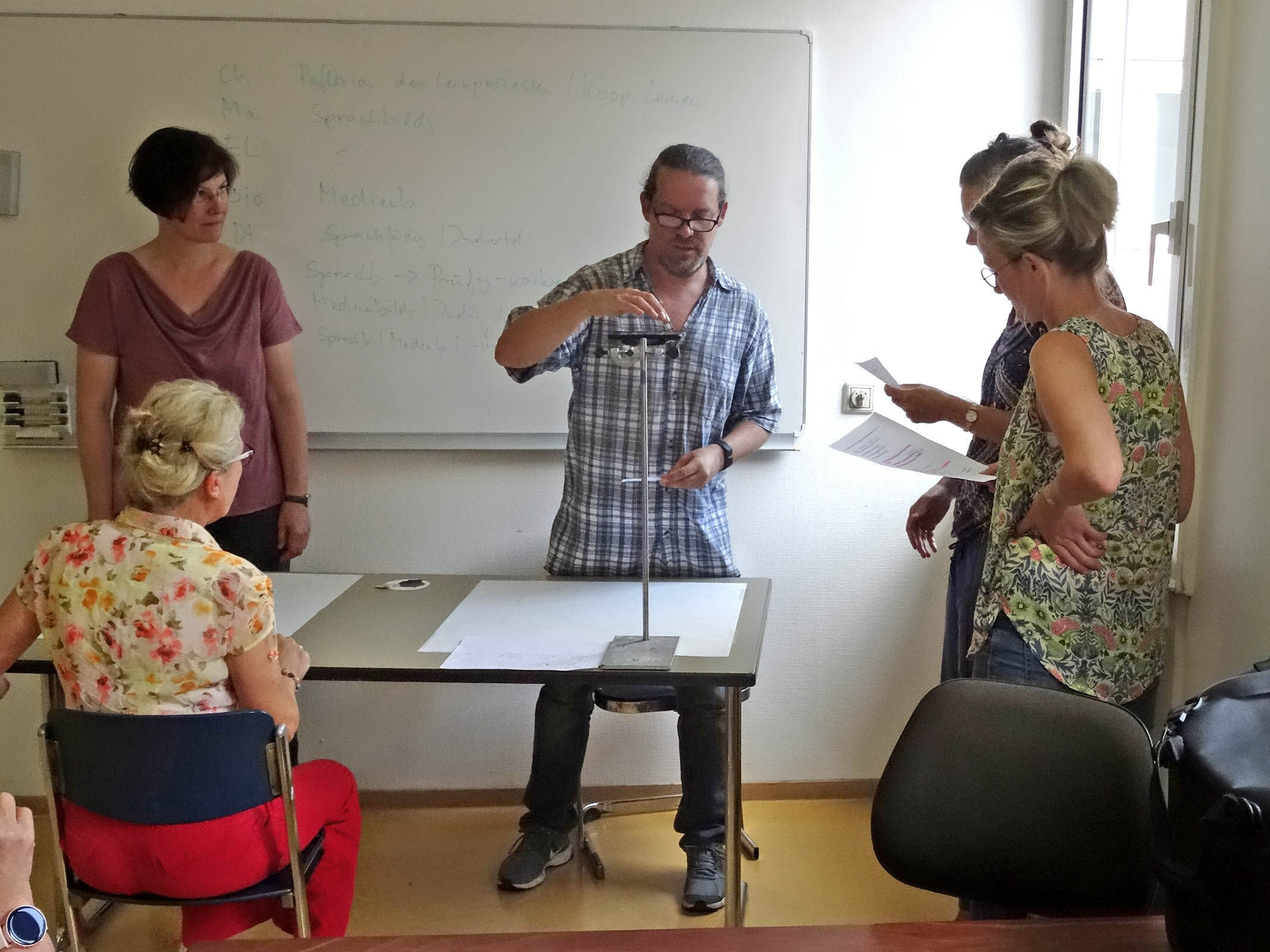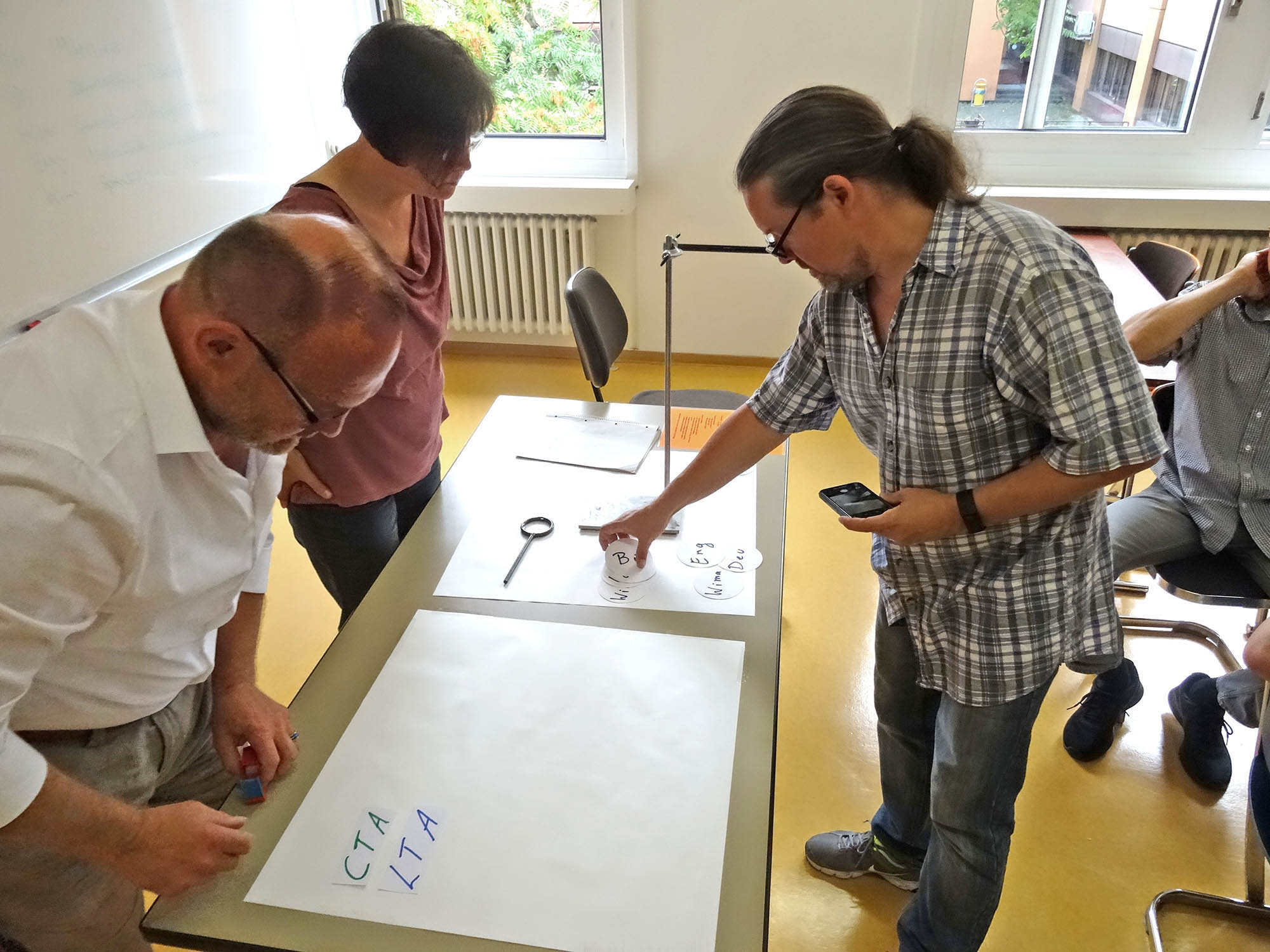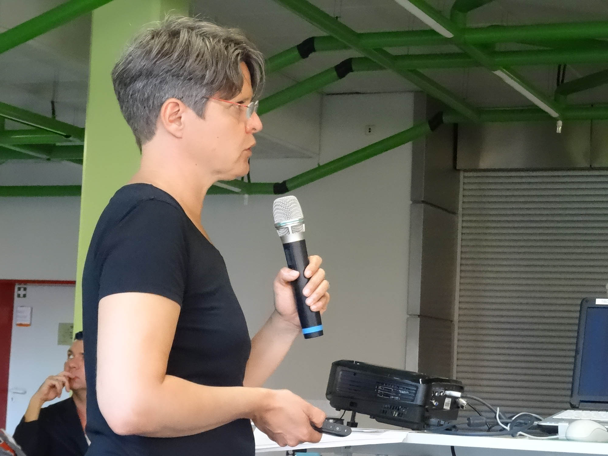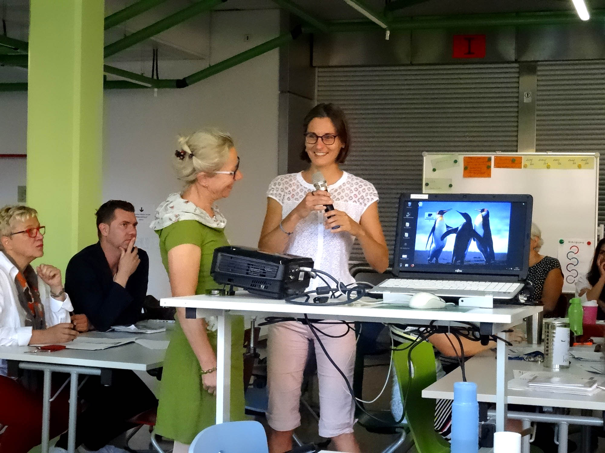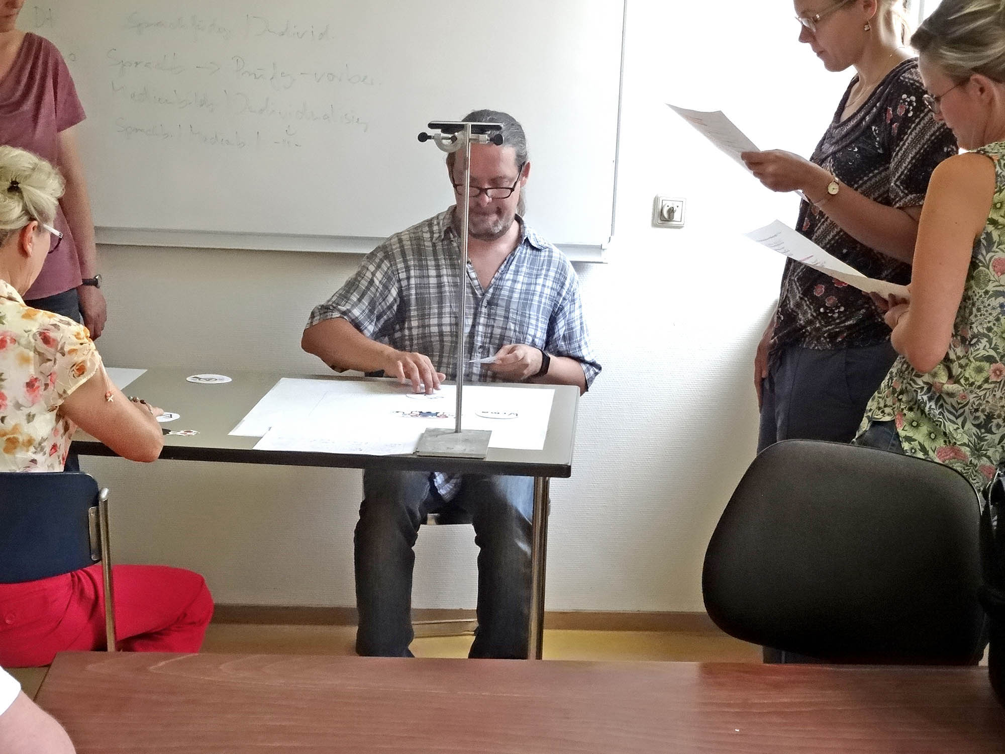 Wie sich Sprachförderung und Medienbildung im Unterricht mit einem Explainity realisieren lassen, erprobten zwei Arbeitsgruppen gleich auch praktisch. Als Explainities werden „Erklärvideos“ bezeichnet, die sich mit einfachen technischen Mitteln, z. B. Smartphones, herstellen lassen. Die gesprochenen Erläuterungen werden dabei durch Texte, Bilder und Symbole illustriert, die von Hand über den Bildhintergrund bewegt werden (Beispiele).