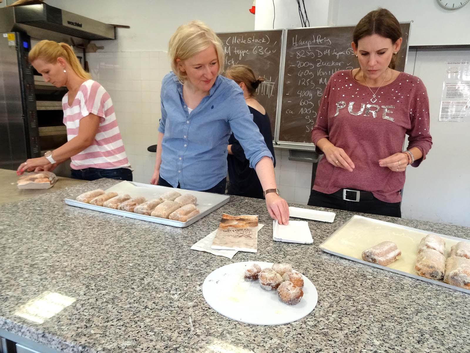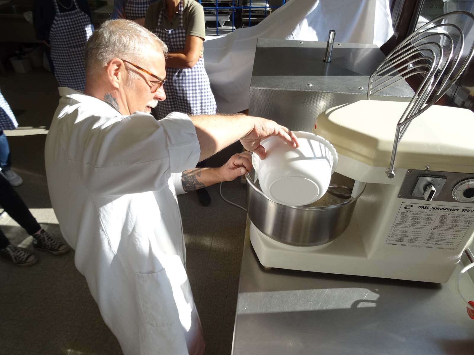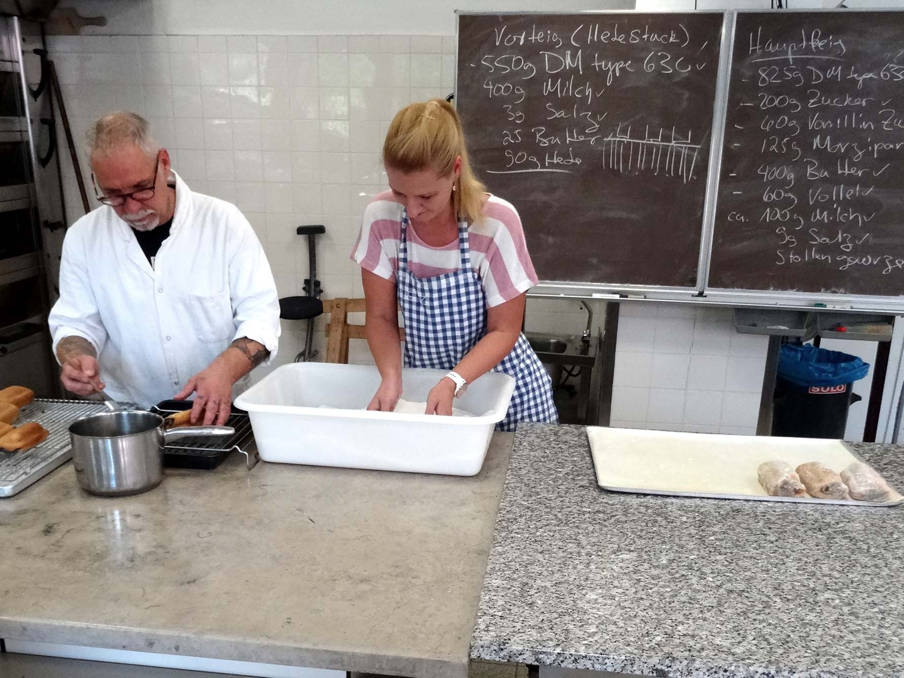 Zum Glück waren alle Zutaten vorhanden, um Vor- und Hauptteig, Mohn- und Nussfüllung herzustellen. Rezeptur und Planung der Produktherstellung sowie alle Arbeitsschritte wurden von Herrn Gish ausführlich erläutert und begründet. Trotz des Einsatzes des Maschinenparks der Bäckerei stellte sich die Herstellung der Dinkelstollen als sehr arbeitsaufwändig dar und bot allen Teilnehmern die Gelegenheit handwerklicher Betätigung.