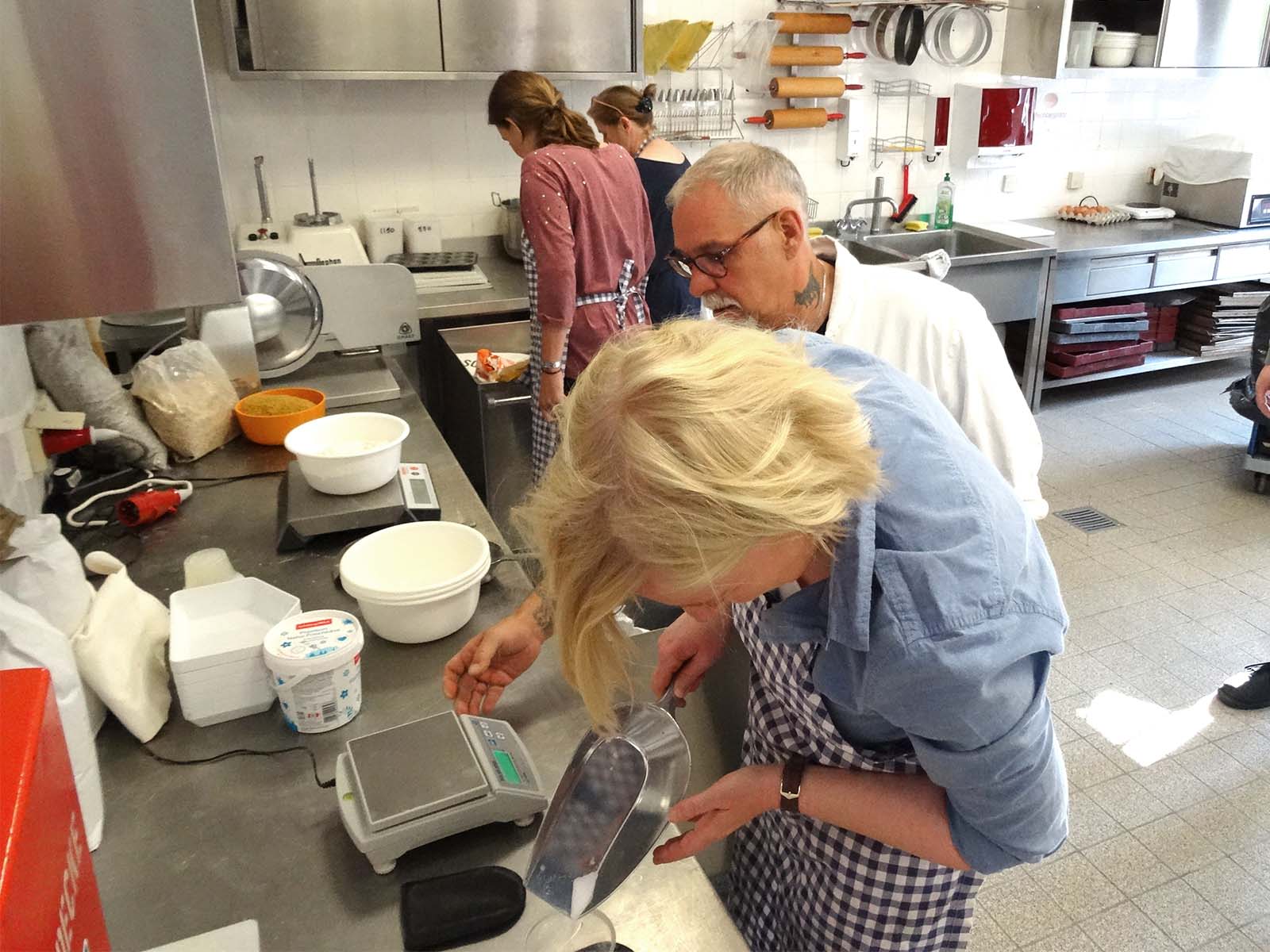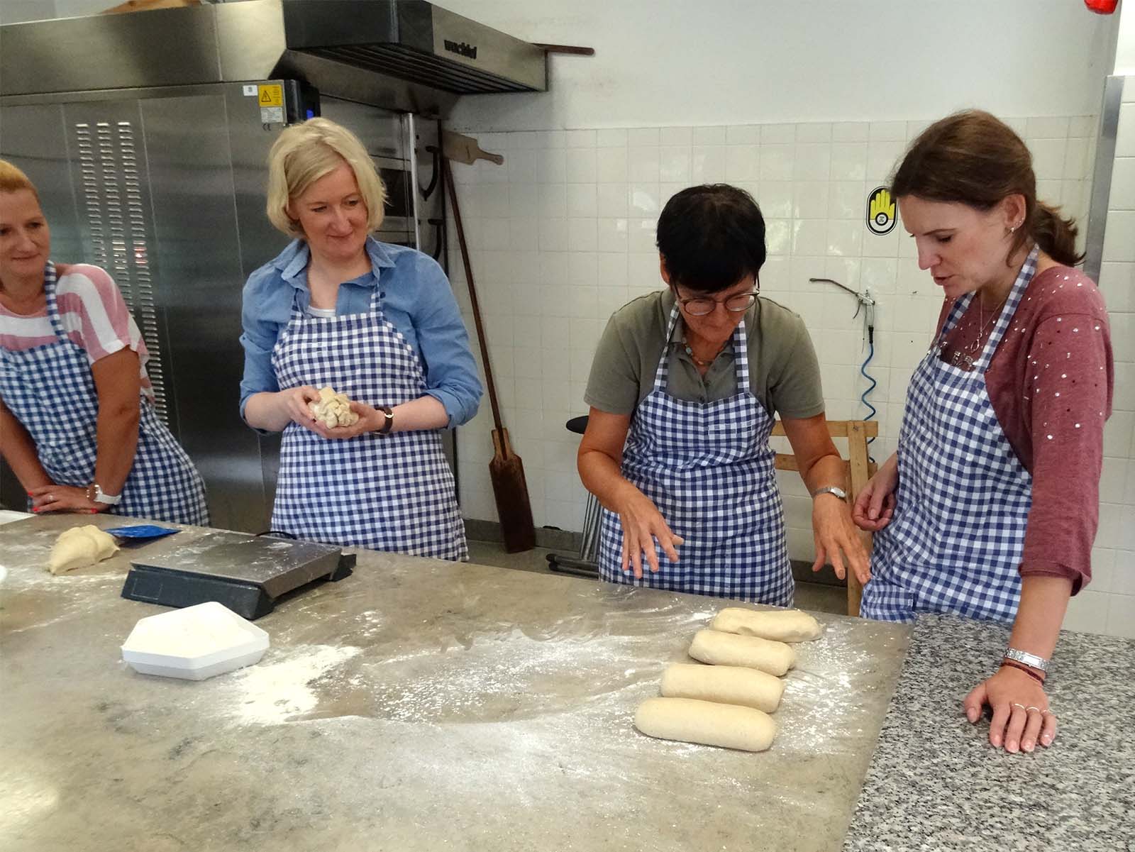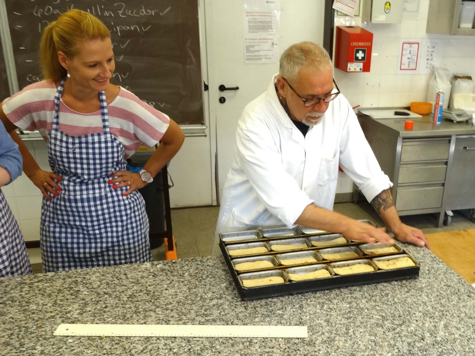 Zum Glück waren alle Zutaten vorhanden, um Vor- und Hauptteig, Mohn- und Nussfüllung herzustellen. Rezeptur und Planung der Produktherstellung sowie alle Arbeitsschritte wurden von Herrn Gish ausführlich erläutert und begründet. Trotz des Einsatzes des Maschinenparks der Bäckerei stellte sich die Herstellung der Dinkelstollen als sehr arbeitsaufwändig dar und bot allen Teilnehmern die Gelegenheit handwerklicher Betätigung.
