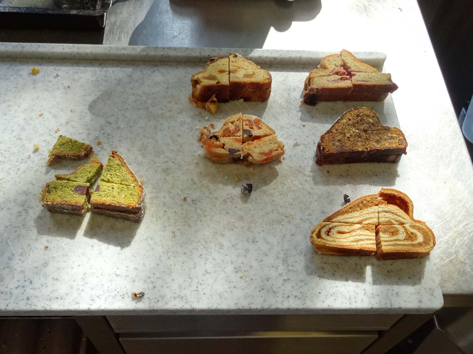 Während der 45 Minuten, die die Stollen im Ofen verbrachten, hatten wir die Gelegenheit, einige „experimentelle“ Stollen zu verkosten, die zuvor von Auszubildenden des 3. Lehrjahrs hergestellt worden waren, z. B. mit Mate-Tee und Brennnesseln in grün, mit Erdnussfüllung oder mit Berberitzen. Sollten sich die Muster bewähren, werden wir sie wohl auf dem Adventsmarkt der Emil-Fischer-Schule wiedersehen…