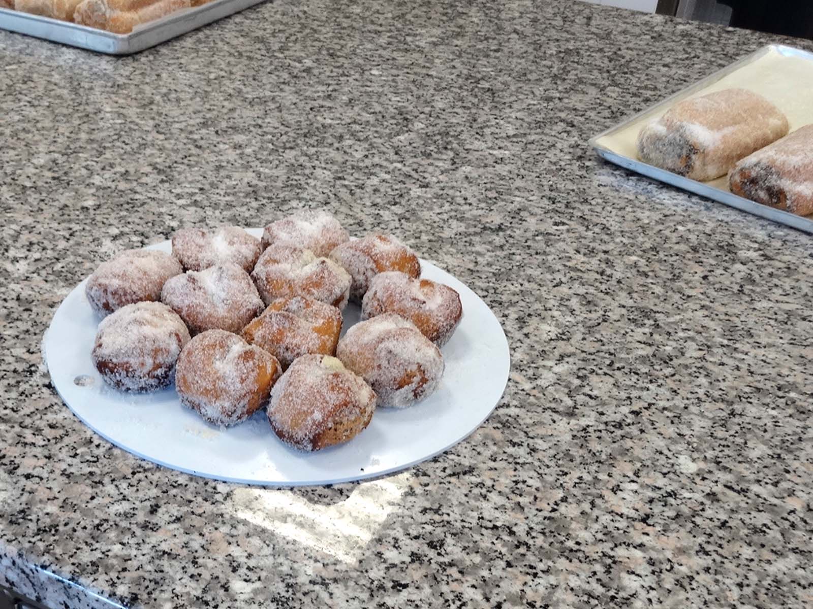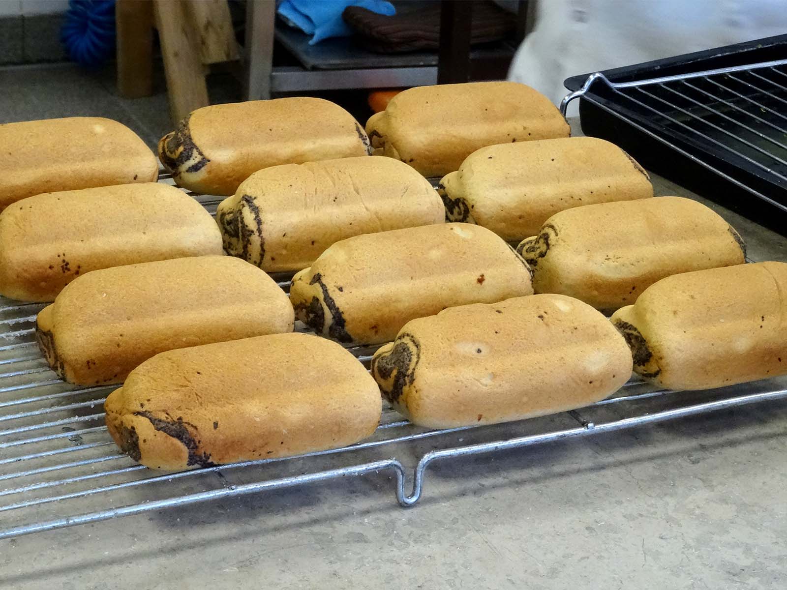 Noch handwarm, konnten wir zum Schluss einige „Stöllchen“ als Ergebnis der eigenen Arbeit verkosten. Alle Teilnehmer konnten darüber hinaus zwei kleine Dinkelstollen mit Nuss- bzw. Mohnfüllung einpacken und mitnehmen. Vielen Dank für die Veranstaltung an Herrn Gish!