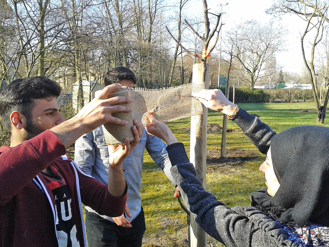 Auf der Streuobstwiese erfolgten erste Baumpflanzungen und ein Bericht aus dieser Zeit zeigt, wie die „Willkommensklasse 61 gräbt, pflanzt und tanzt".