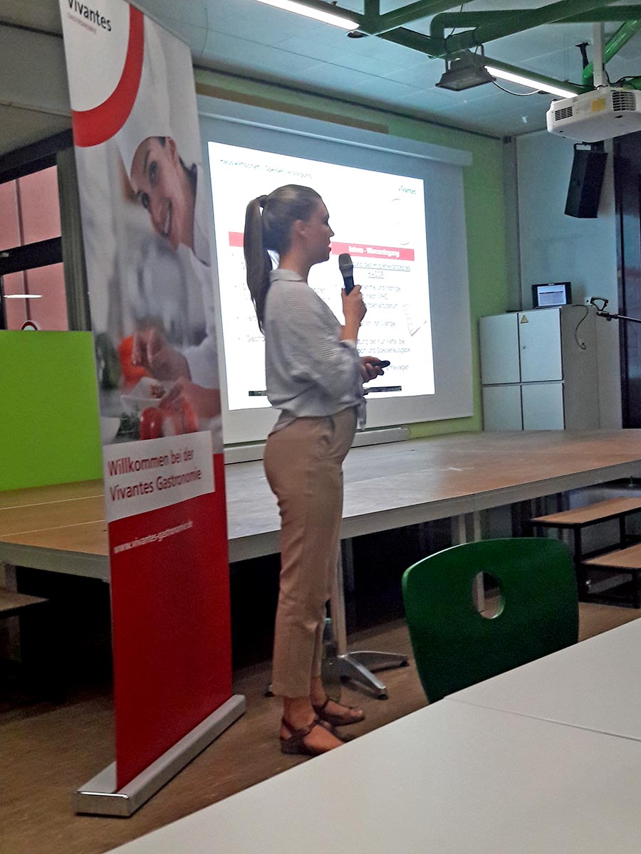 Nadine Jaenisch, die Leiterin des Bereiches Hauswirtschaftsmanagement der Vivantes Hauptstadtpflege, und Andrea Krege, Ausbilderin im Berufsbereich Hauswirtschaft, stellten ihren Berufsbereich Hauswirtschaft und Speisenversorgung den berufsvorbereitenden Lehrgängen IBA Ernährung und IBA Gesundheit, den Assistent(inn)en für Ernährung und Versorgung (AEV) und den Hauswirtschafter(inne)n im dualen System, speziell dem 3. Ausbildungsjahr, vor.