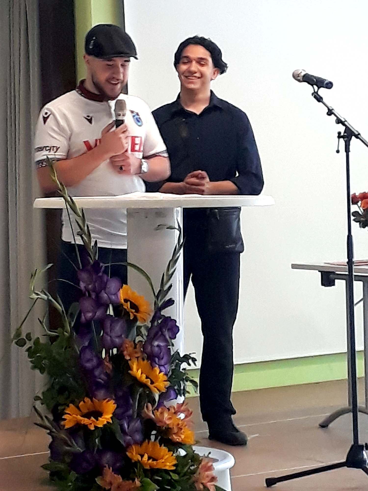In feierlicher Stimmung erhielten sie in unserer Aula ihre Abiturzeugnisse. Die Tutorinnen und Tutoren verabschiedeten z. T. mit schauspielerischen Einlagen die ihnen anvertrauten Schüler/-innen. Es gab nicht nur freundliche Worte, sondern auch Präsente, Blumen, Kugelschreiber und für die Besten Bücher.