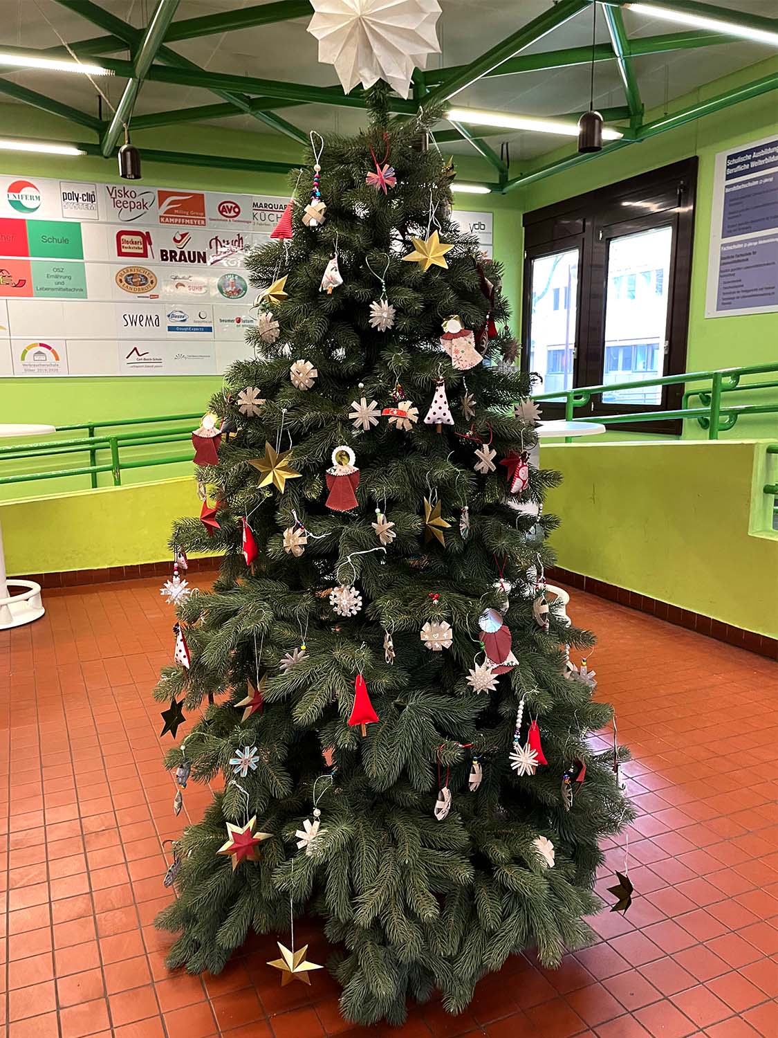 Das gesamte Kollegium sammelte eifrig Papprollen, so dass die Schüler und Schülerinnen sehr viele fantasievolle Sterne basteln konnten. Die Sterne sind am Weihnachtsbaum im Eingangsbereich der Schule zu bewundern.