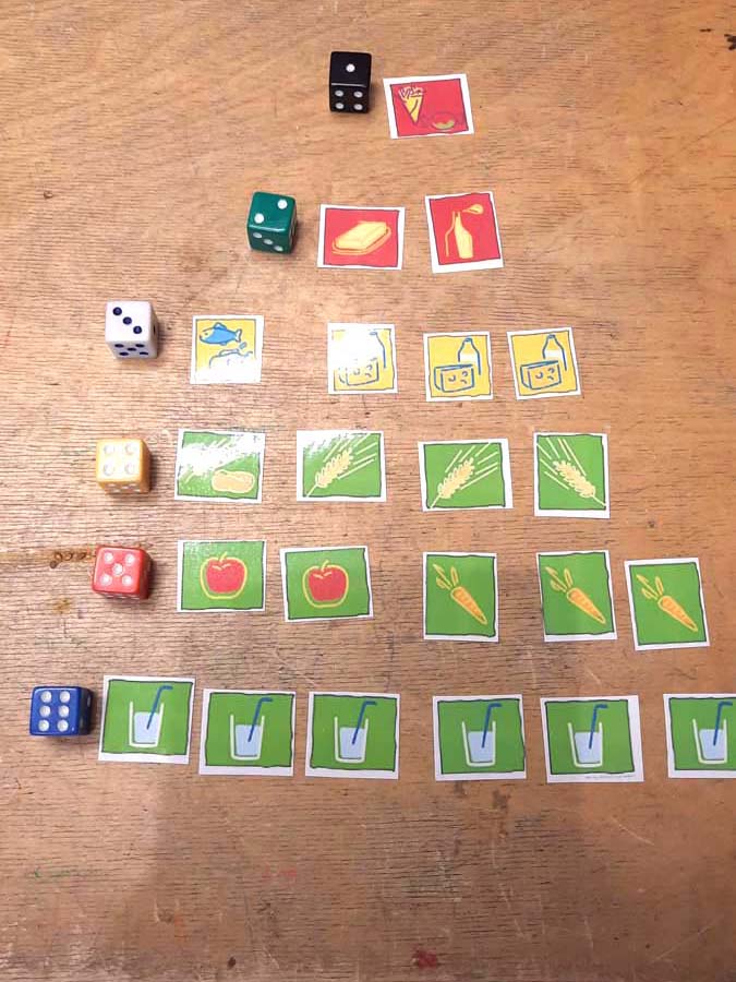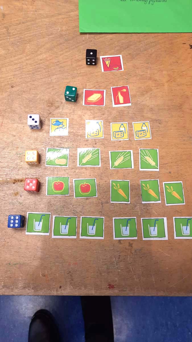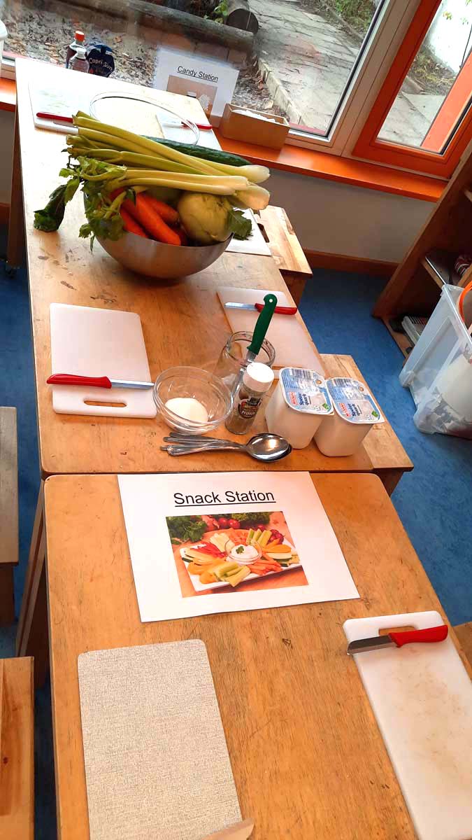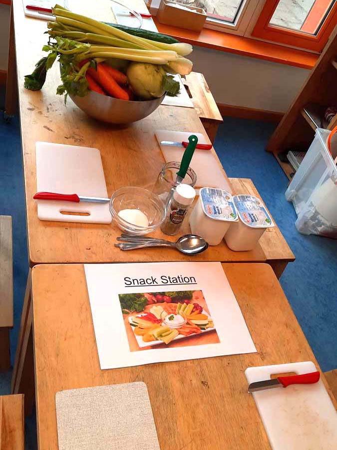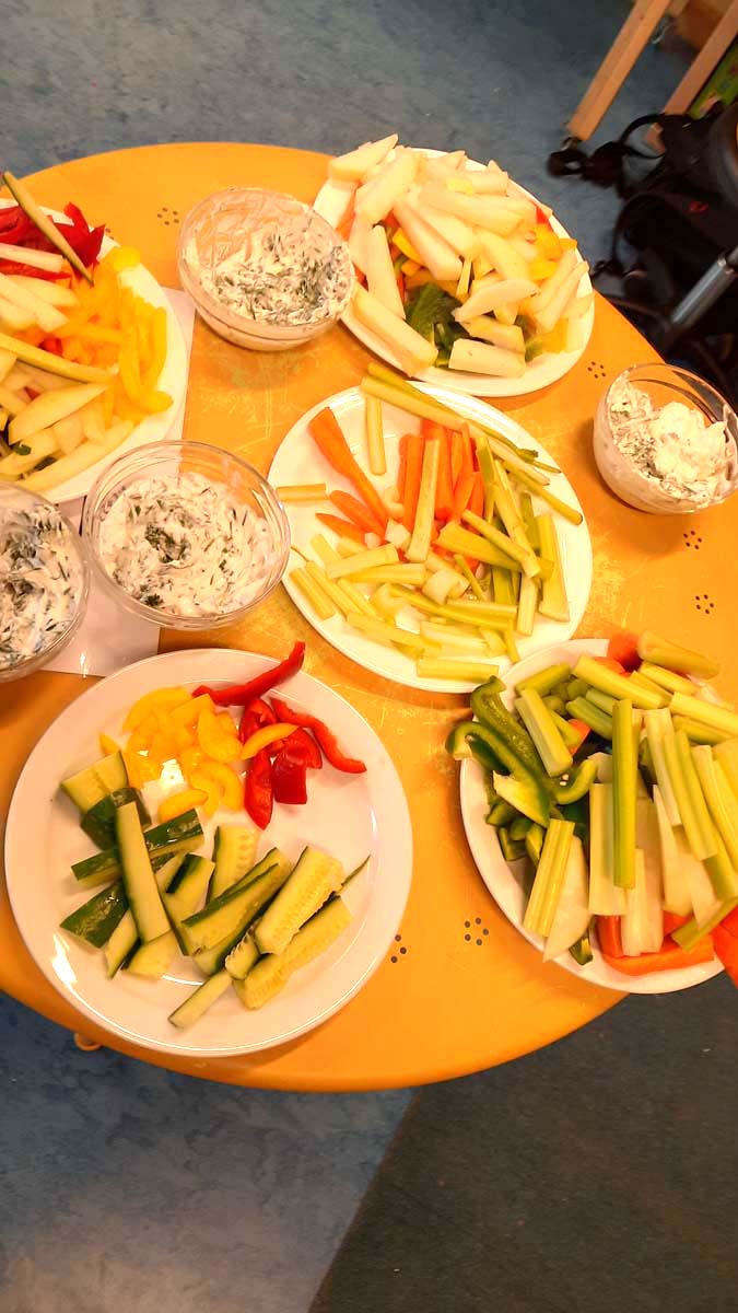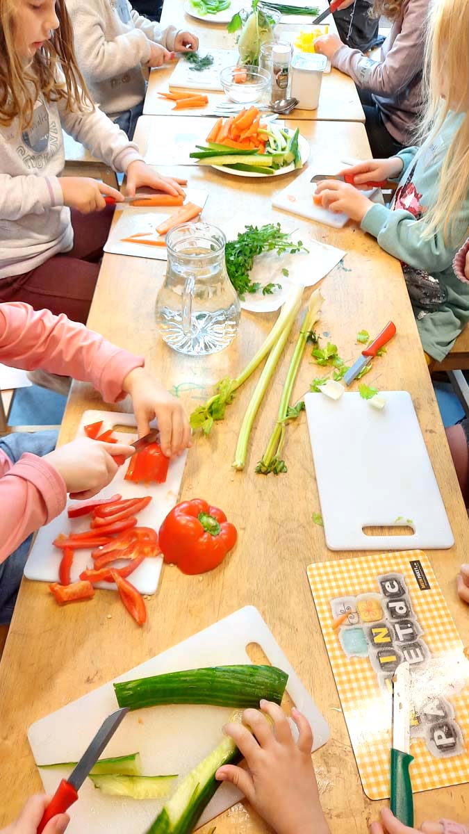 Wir, die angehenden Hauswirtschafter/-innen des 3. Ausbildungsjahres, planten zunächst ein Kennenlernspiel und fünf tolle Stationen zum Thema Gesunde Ernährung. In den einzelnen Stationen sollten die Kinder einen Quark-Dipp herstellen und dazu Gemüse in Stifte schneiden. In selbstgebastelten Fühlboxen konnten Sie mit ihren Sinnen Obst ertasten und anschließend mit verbundenen Augen erschmecken. An einer Ernährungspyramide wurde den Kindern die Menge an Lebensmitteln, die sie pro Tag essen sollten, veranschaulicht.