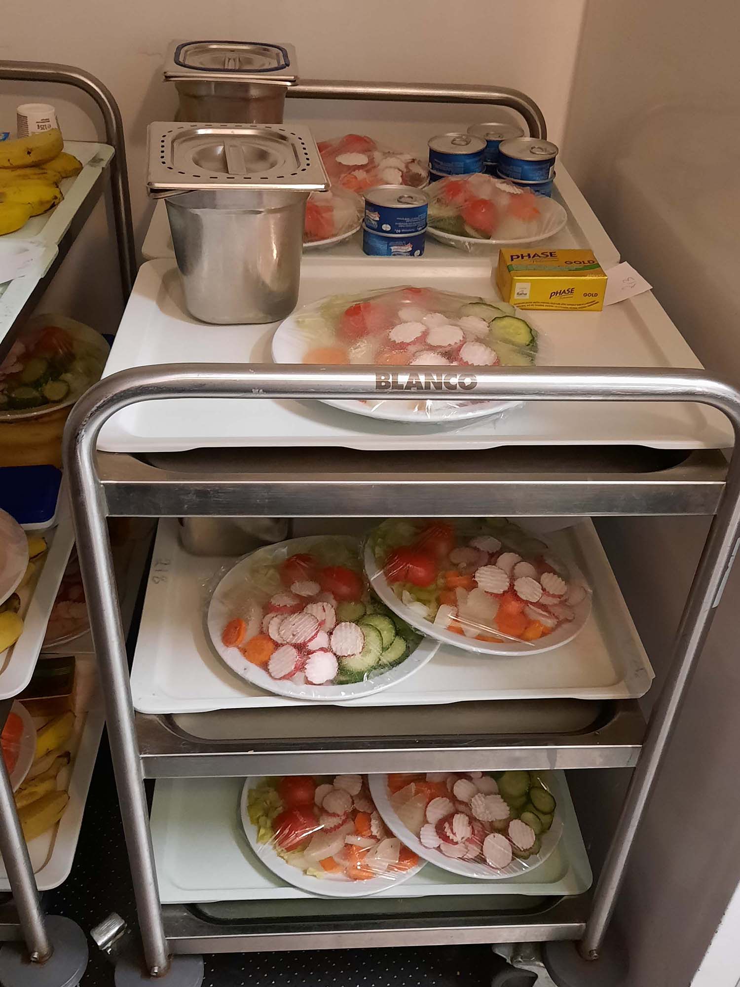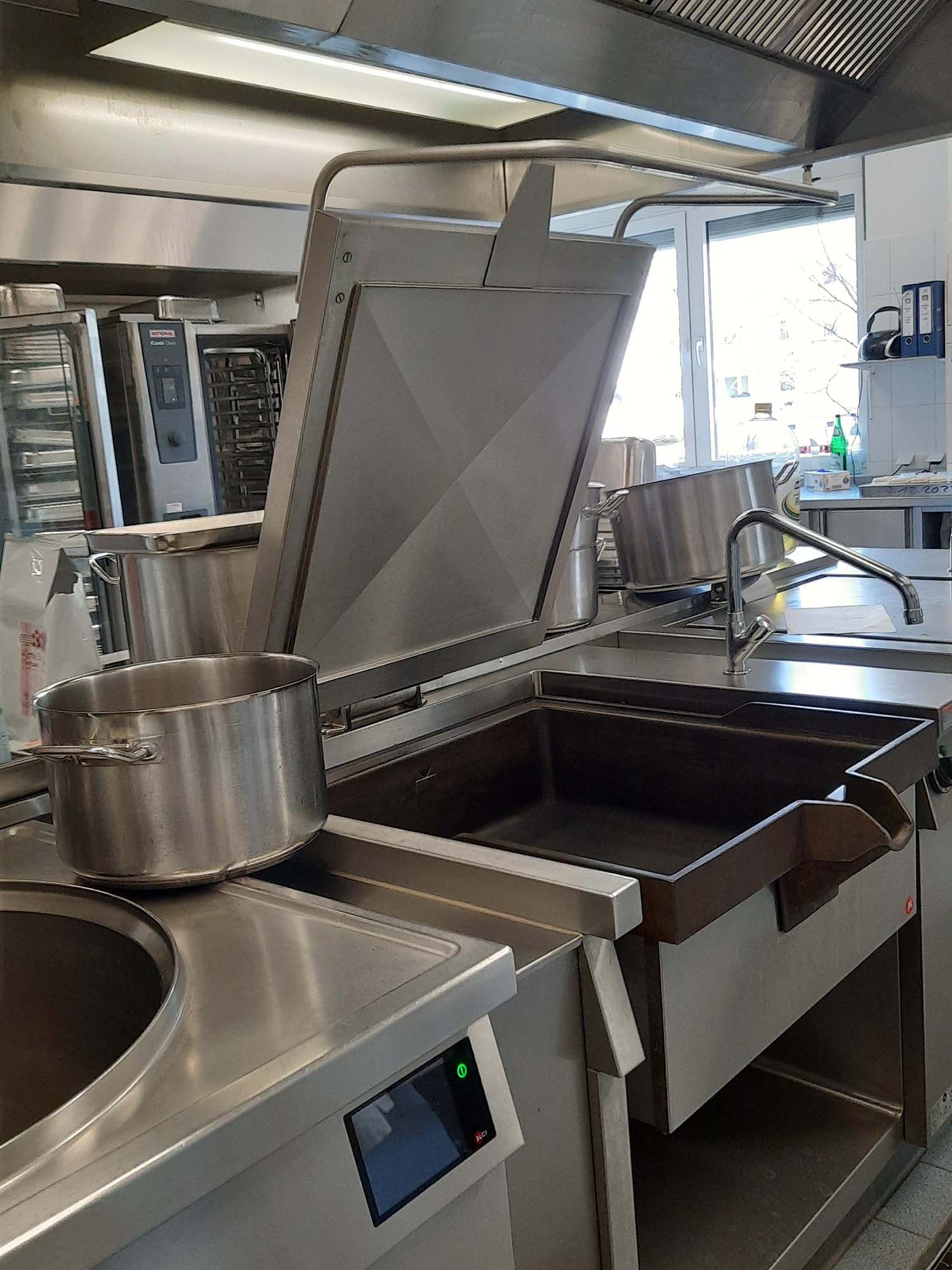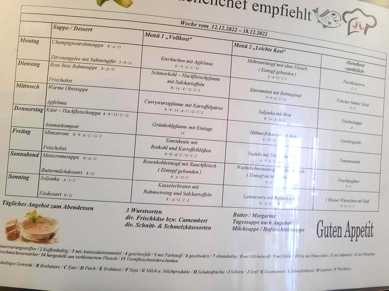 Wir wurden zuerst in der Küche und der angrenzenden Cafeteria herumgeführt. Hier werden täglich ca. 420 Essen für die Bewohner/-innen des Hauses sowie der Tagespflege, für die Mitarbeiter/-innen und Kinder einer angrenzenden Kita zubereitet. Es gibt täglich zwei Essen zur Auswahl. Wir bekamen Einblicke in die kalte und warme Küche, die Kühlräume und in eine Lehrküche für Auszubildende.