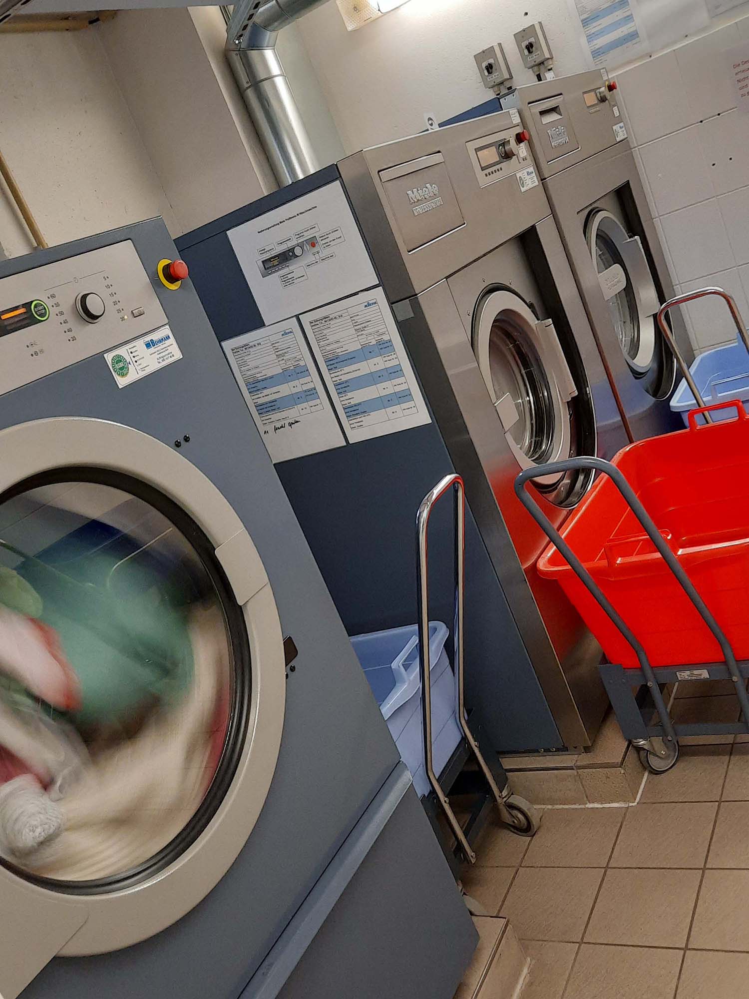 Anschließend wurde uns der Wäschepflegebereich gezeigt, wo die Wäsche der Bewohner/-innen gewaschen, getrocknet und bei Bedarf auch genäht wird. Es gibt zudem eine Bügel- und Mangelstation.