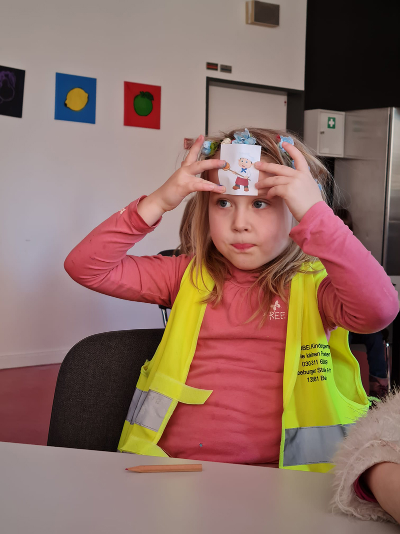 In der zweiten Station mussten die Kinder Berufsbilder rund um Ernährung erraten. Dazu haben die Kinder sich ein Bild auf die Stirn geklebt und die anderen Kinder sollten das Bild beschreiben und das Kind selbst den Beruf erraten, der auf dem Bild abgebildet ist. Danach haben wir erklärt, welche Tätigkeiten in diesen Berufen wichtig sind. Wenn noch Zeit übrig war, konnten die Kinder Bilder von verschiedenen Berufen oder deren „Traumberuf“ malen.