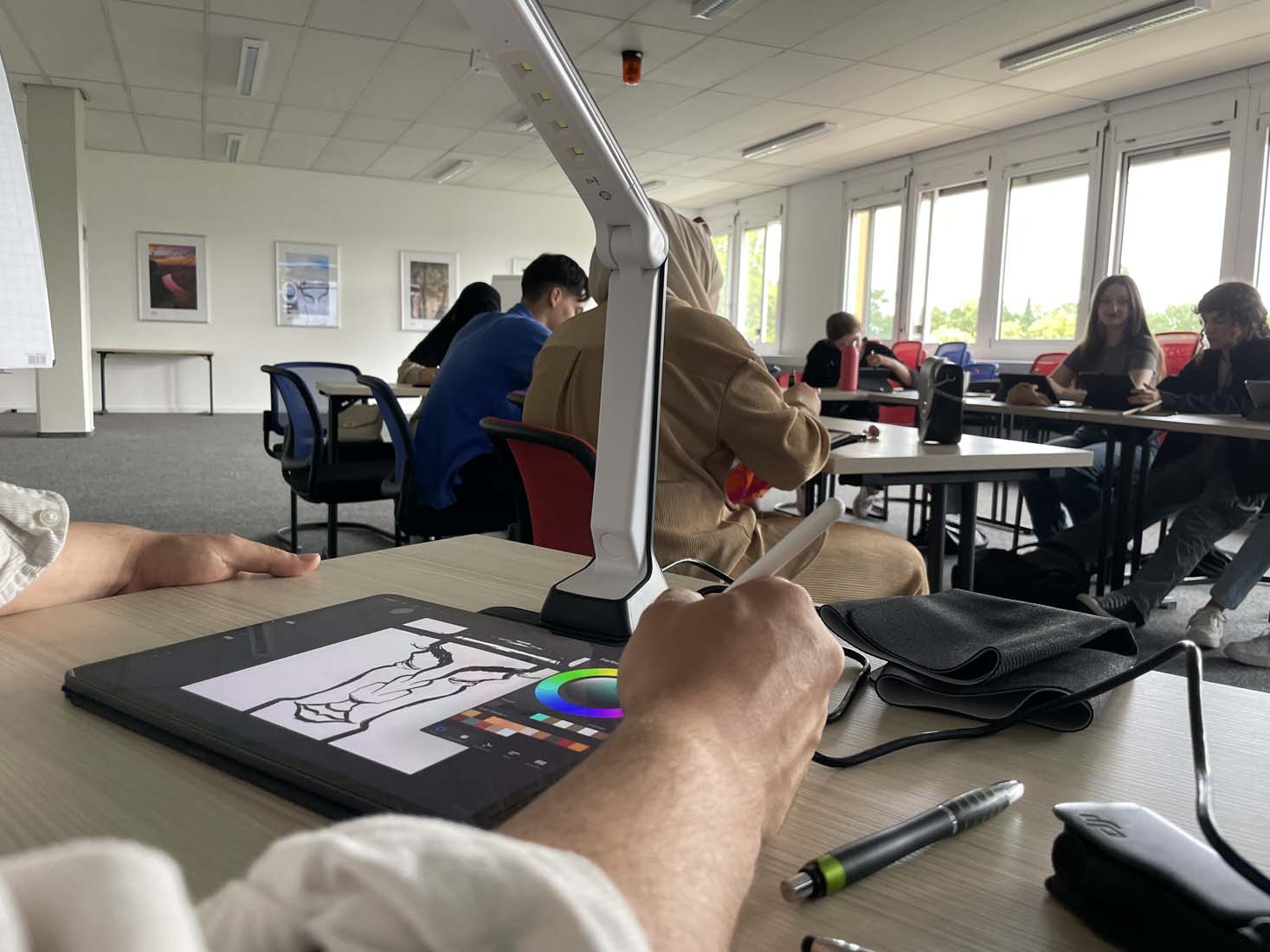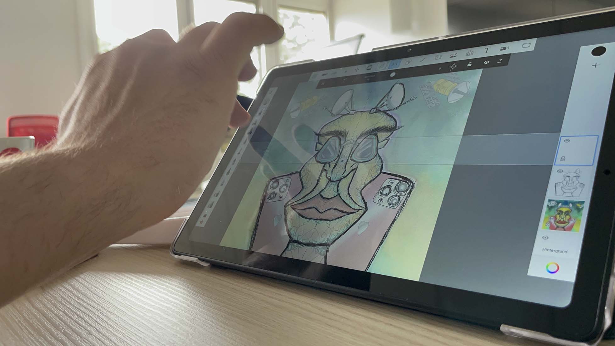 Des Weiteren lernten sie im Workshop vom Künstler die Technik des digitalen Zeichnens. Jede/-r hatte die Gelegenheit, diese direkt auf dem Tablet anzuwenden. Schnell eigneten sich die Schülerinnen und Schüler die wesentlichen Tools des Zeichenprogramms an und legten los. Freude über die gelungenen Erstlingswerken war deutlich spürbar – auch bei Personen, die sich zuvor als talentfreie Zeichner/-in bezeichneten.