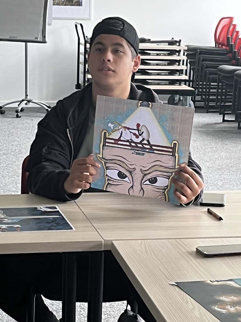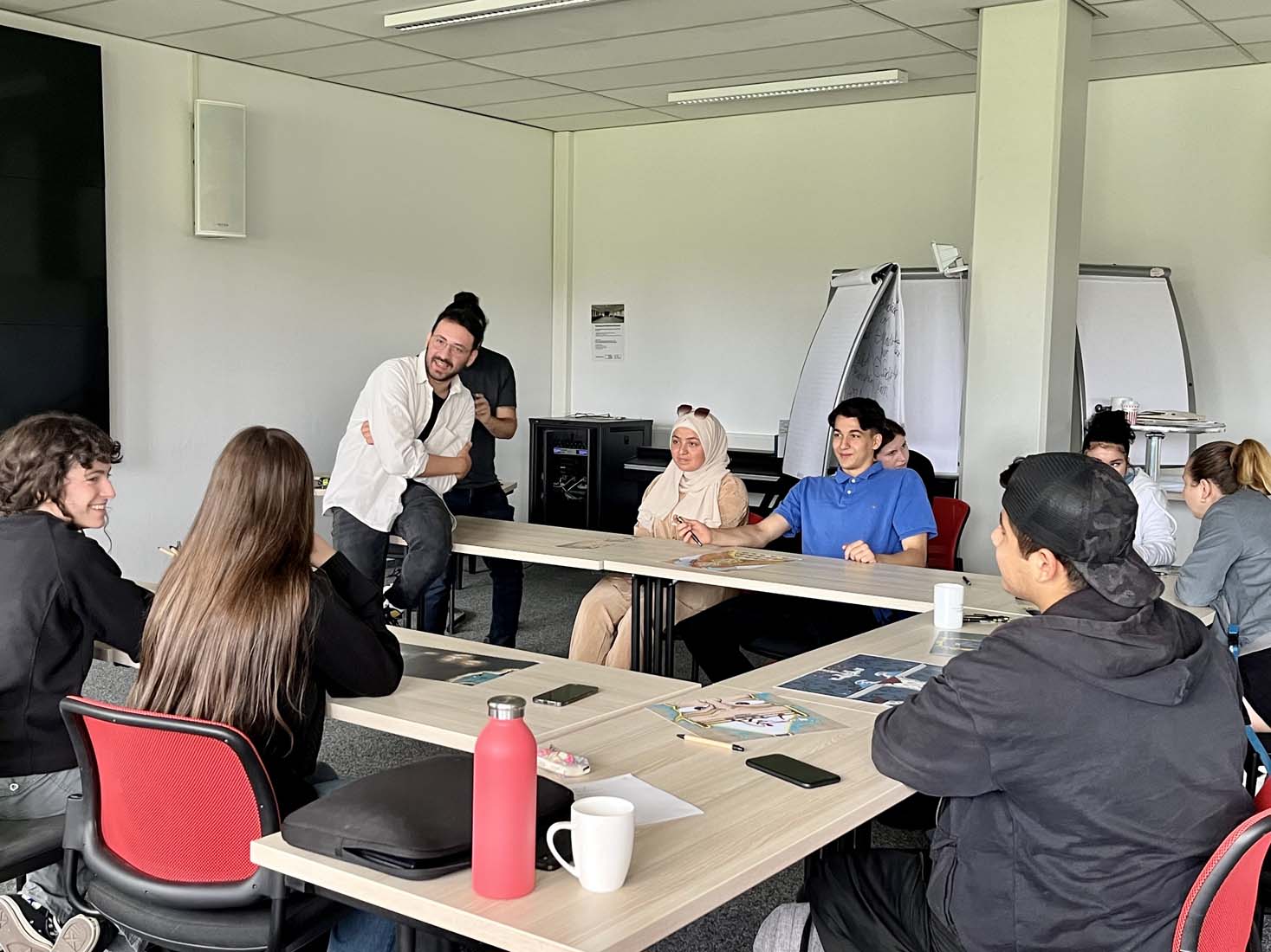 Der Kunstworkshop „Kunst als politisches Kommunikationsmittel“ am 5. Juli 2023 wurde von Ismail Tsavous geleitet. Der junge Künstler aus Berlin stellte seine Kunst vor und erklärte den Schülerinnen und Schülern nicht nur die ästhetischen Aspekte seiner Kunst, sondern verwies auf die politischen Aspekte seiner Kunstwerke. Die Diskussion bzw. Interpretation der dargebotenen Tsavous-Zeichnungen verlief sehr angeregt und führte zu einer regen Beteiligung der Workshop-Teilnehmer/-innen.