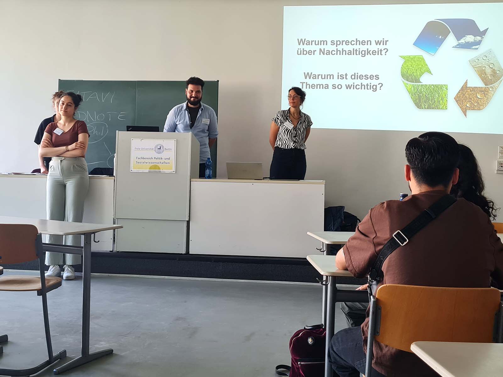 Start des Projekts war der Besuch der Freien Universität Berlin (FU), in der die Lehramtsanwärter/-innen, die das Projekt für uns geplant und durchgeführt haben, bereits auf uns warteten. Thema des Workshops war die Gestaltung einer „Nachhaltigen Mensa“ bzw. Essensverpflegung in Schulen. Um hier qualifiziert arbeiten zu können, lernten die Schüler/-innen den Begriff Nachhaltigkeit kennen und knüpften mit Beispielen an ihr Wissen an. Zum Abschluss des ersten Projekttages besuchten wir die Mensa und Großküche der FU und konnten dem Küchenchef Fragen stellen.