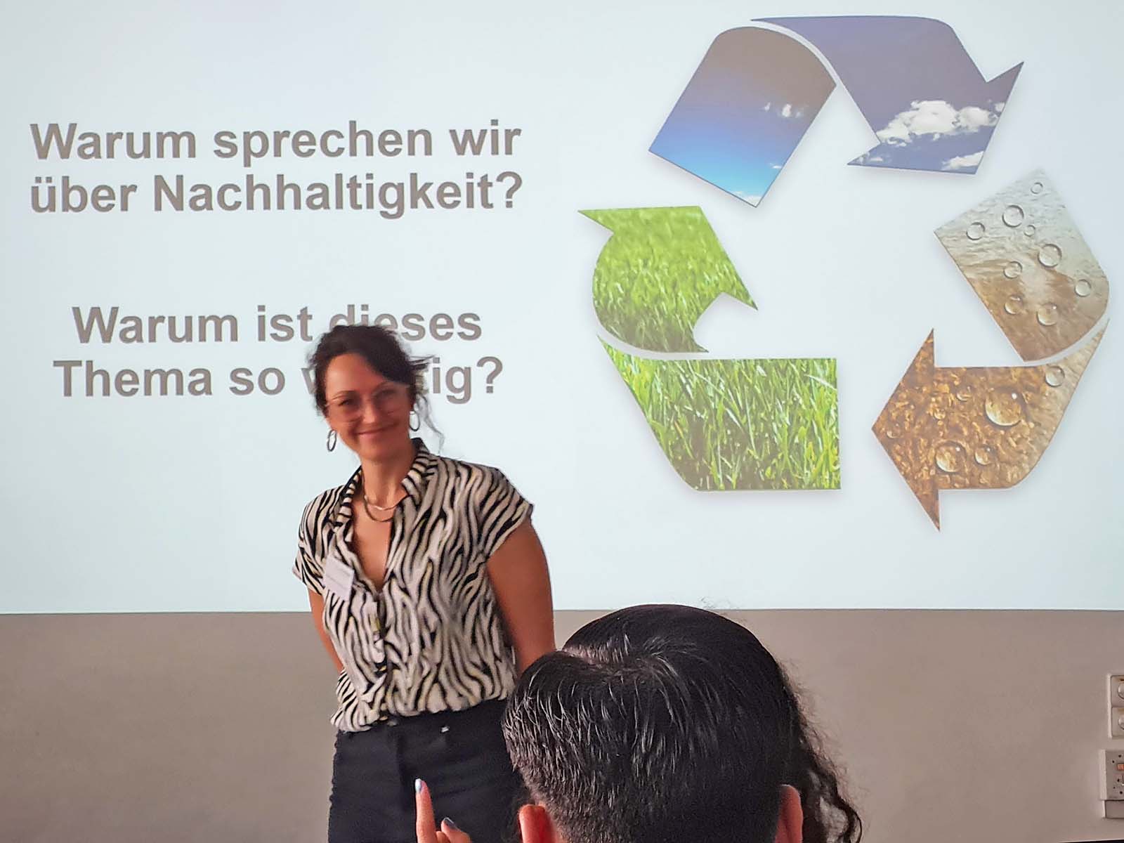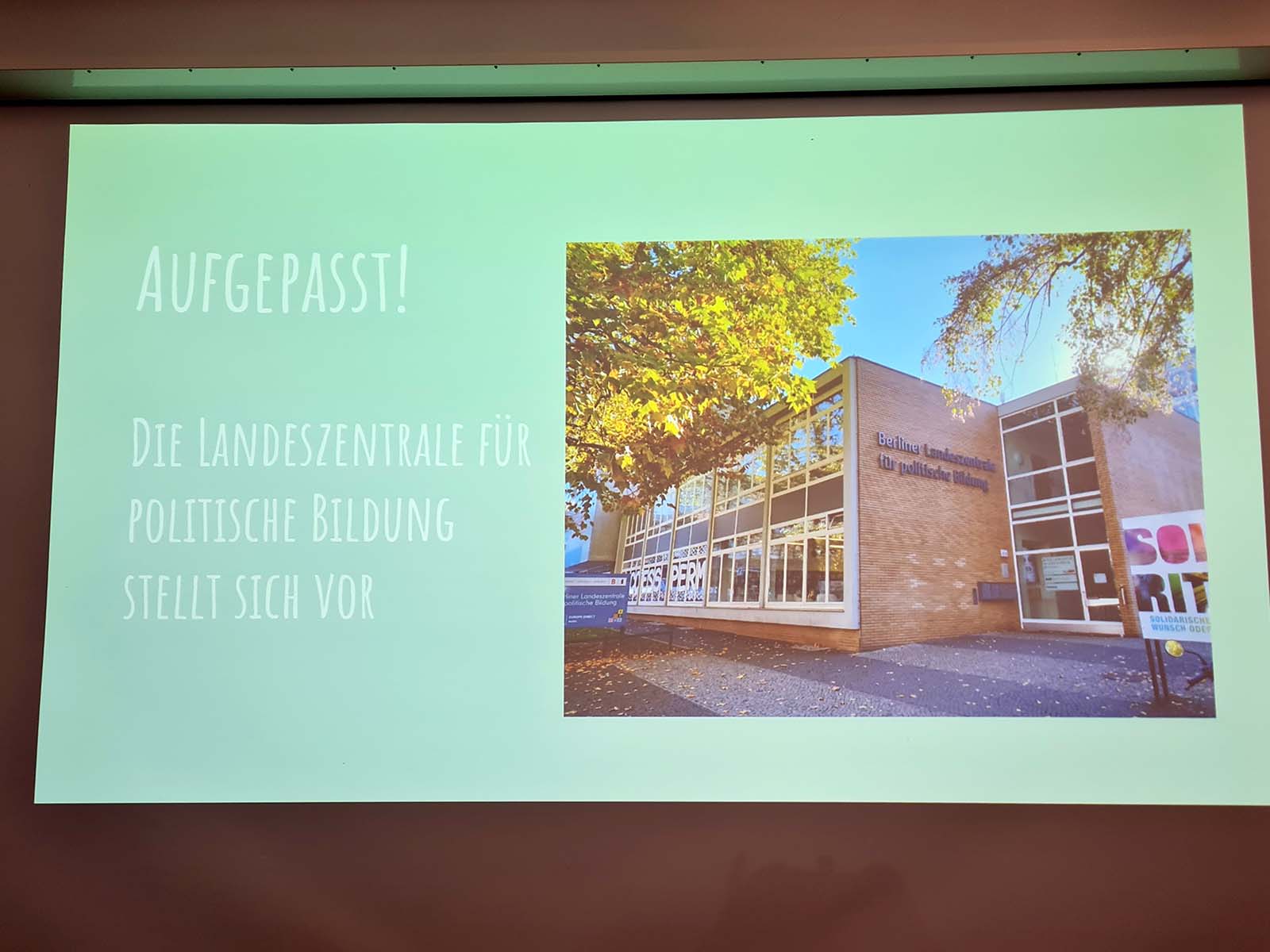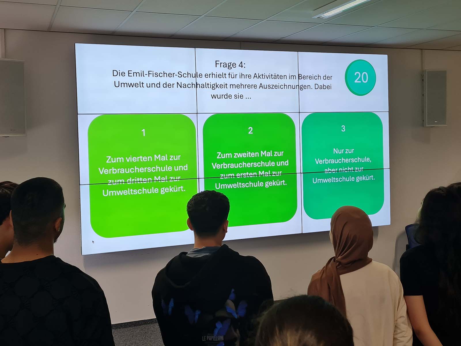Der letzte Projekttag fand in der Landeszentrale für politische Bildung statt. Ein Speedtalk mit drei Politikerinnen und einer Expertin aus der Emil-Fischer-Schule wurde organisiert. Es kam zu einem regen und sehr konstruktiven Austausch, z. B. über Möglichkeiten der Müllreduzierung. Auch der Wunsch nach dem Einsatz von Geschirr- oder einem Pfand-Mehrwegsystem in unserer Cafeteria kam wiederholt zur Sprache.