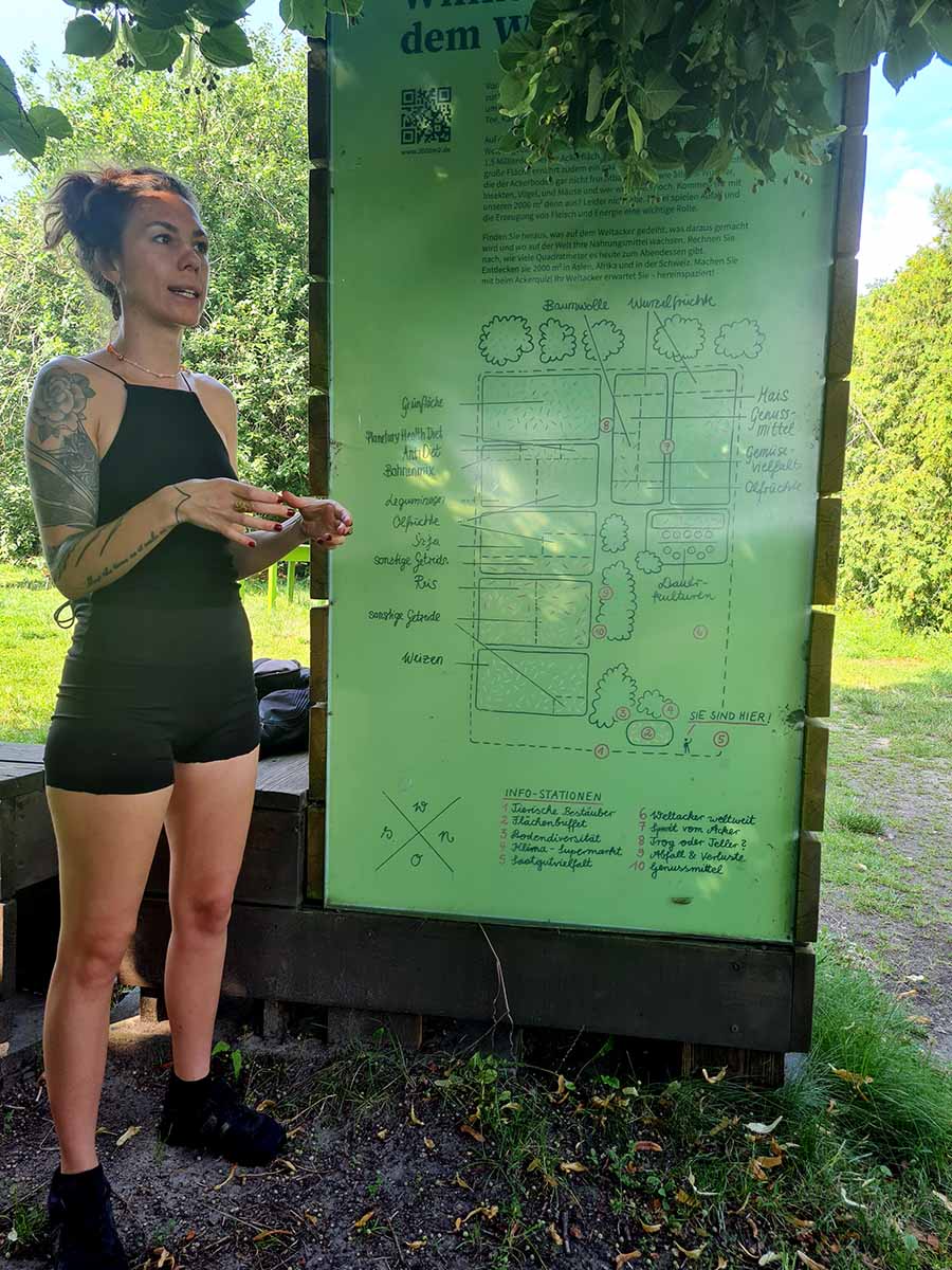 Was ist der Weltacker? Diese Frage drängt sich auf, und zwar bevor man diesen wundervollen Ort betritt. Hierzu zitiere ich gerne die Webseite des "Weltackers": „Wenn wir die globale Ackerfläche von 1,6 Milliarden Hektar durch die Zahl der Erdenbürger teilen, ergibt das 2000 m² pro Nase. Darauf muss also alles wachsen, womit Mutter Erde uns nährt und versorgt: Brot, Reis, Kartoffeln, Obst, Gemüse, Öl, Zucker… aber auch all das Futter für die Tiere, deren Fleisch, Milch und Eier wir verzehren, Baumwolle für Jeans, Tabak für Raucher*innen, Bio-Gas oder Bio-Diesel und nachwachsende Rohstoffe für die Industrie.“