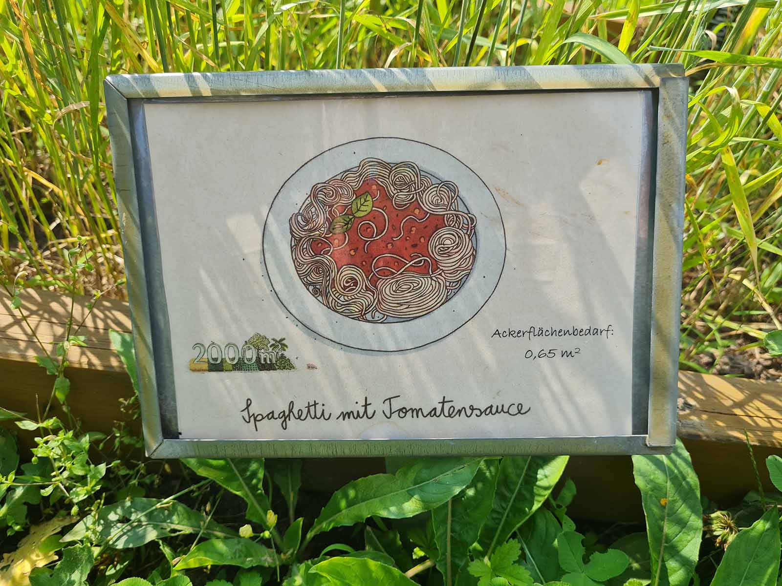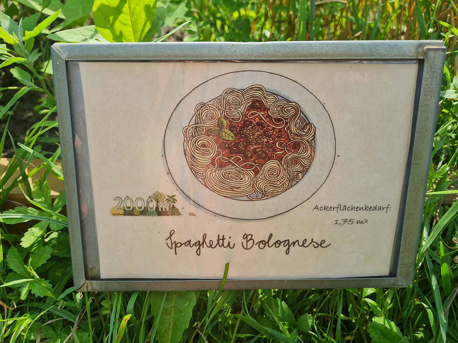 Um dieses Thema ein wenig mehr zu visualisieren, ging der erste Workshopteil in Richtung des Flächenbuffets. Hier werden die Ackerflächen für verschiedene Gerichte dargestellt. Dieses Jahr habe ich mich für den Vergleich zwischen Nudeln mit Tomatensauce und Nudeln mit Bolognese Sauce entschieden. (Flächenbuffet Beispiel vom vergangenen Jahr „Müsli mit verschiedenen Milchsorten“ (Emil-Fischer-Schule zu Besuch auf dem Weltacker). Hierbei kann man visuell sehr gut erkennen, was der zusätzlich enthaltene Rohstoff Fleisch für die Ackerfläche bedeutet, denn auch das Futtermittel muss mit angebaut werden.