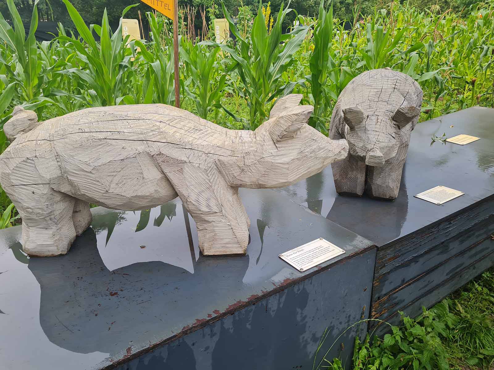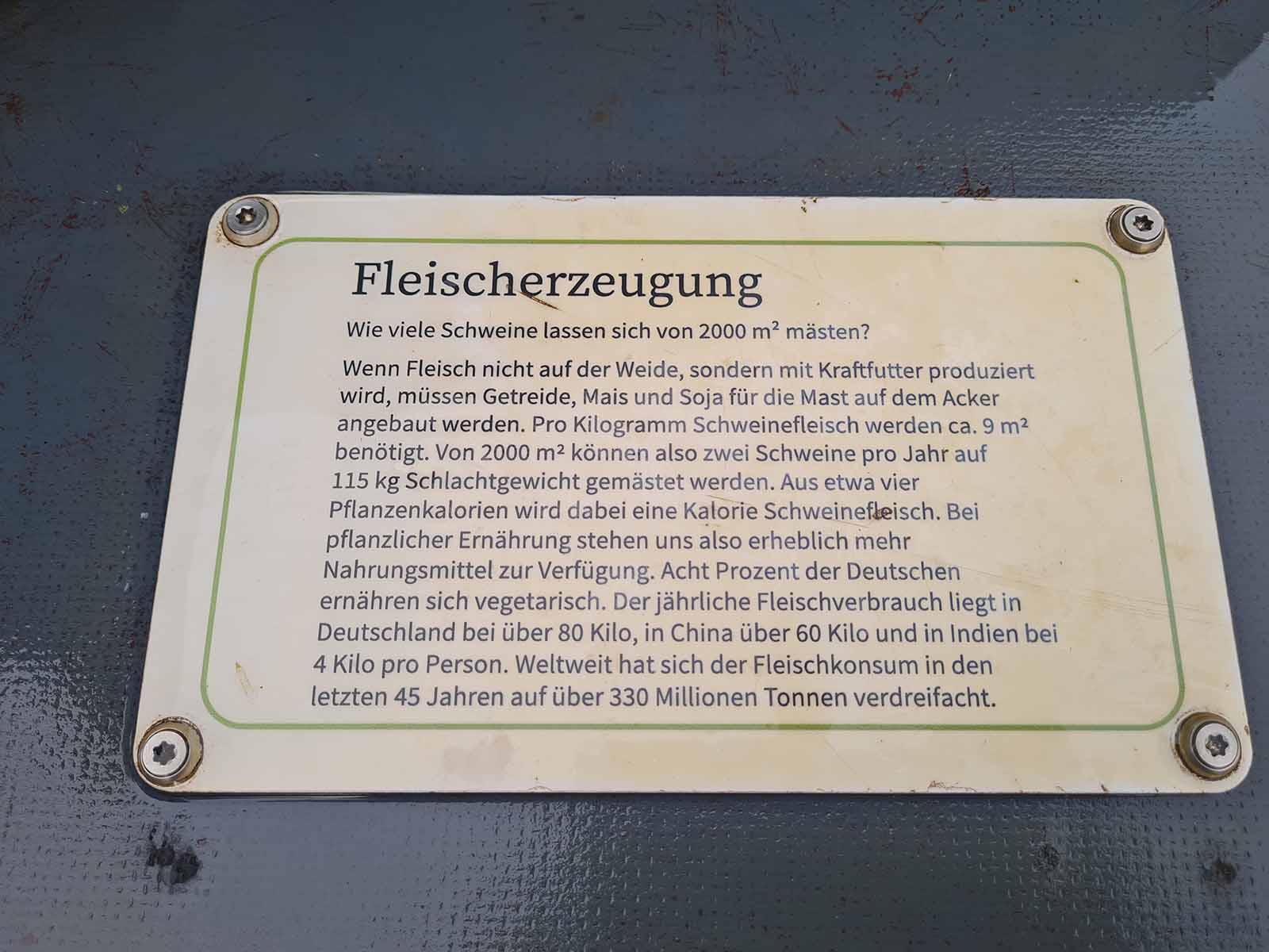 Um das Thema Futtermittel noch weiter zu verdeutlichen, stehen auf dem Weltacker zwei symbolische Schweine. Warum gerade zwei könnte man sich hierbei fragen. Auch dieser Fakt hat hier eine Bedeutung: mit der Ackerfläche von 2000 m2 können zwei Schweine ein Jahr lang zum Schlachtgewicht gefüttert werden. Dies wiederrum bedeutet, dass bei einem durchschnittlichen Schweinefleischkonsum der deutschen Bevölkerung (54 kg pro Jahr) ein Viertel eines Ackers nur für das Futtermittel genutzt wird, welches wir dann als Schweinefleisch verzehren. In dieser Zahl ist allerdings noch nicht der ganze Fleischkonsum der durchschnittlichen deutschen Bevölkerung einbezogen. Dies verdeutlich sehr gut das Ungleichgewicht zwischen der theoretisch vorhandenen und der tatsächlich verbrauchten Ackerfläche. Dies soll nicht bedeuten, dass wir kein Fleisch mehr Essen sollten, aber es soll als Denkanstoß dienen den Fleischgenuss vielleicht wieder etwas bewusster zu gestalten.