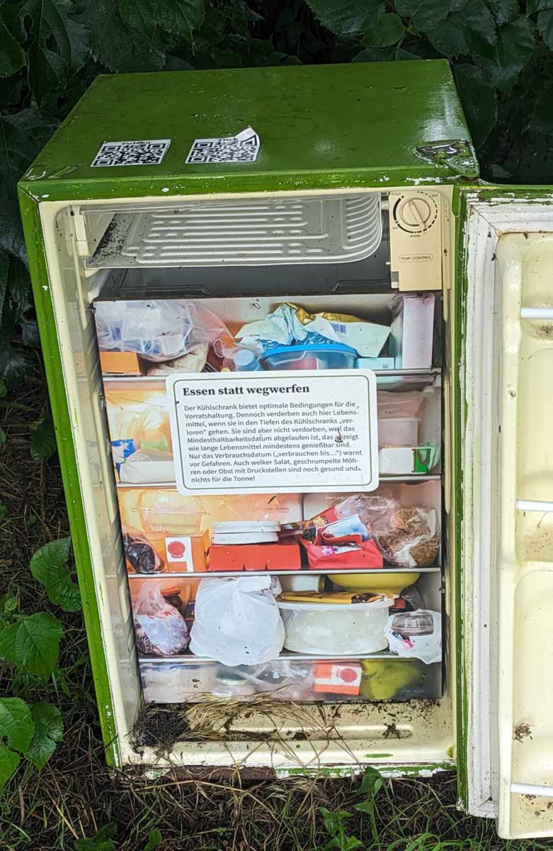 Auch das Thema „Lebensmittelverschwendung“ wird auf dem Weltacker dargestellt. Hierzu laden Mülltonnen und ein verdreckter Kühlschrank ein, um sich selbstständig zu informieren. In Deutschland sind es durchschnittlich 5 000 000 Tonnen an Lebensmitteln, die durch die Industrie und Haushalte verschwendet werden. Auch dieser Teil wurde durch die Acker-Tour nochmal intensiver verdeutlicht und schockierte die Besucher*innen mit hohem Verschwendungszahlen.