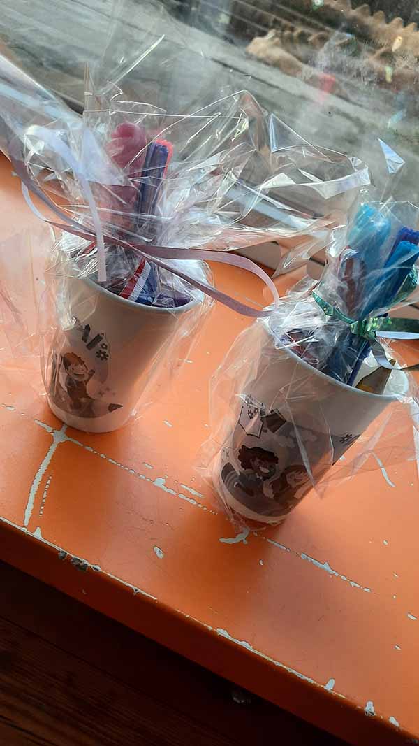 Wir wurden in vier Gruppen aufgeteilt, und jede Gruppe führte eine Station durch. Gegen 9:45 Uhr waren wir vor Ort. Zunächst zogen wir einheitliche Kleidung an, um als Team besser erkennbar zu sein. Danach holten wir die benötigten Materialien aus einem kleinen Lagerraum, der sich in der Sporthalle des Kindergartens befindet.