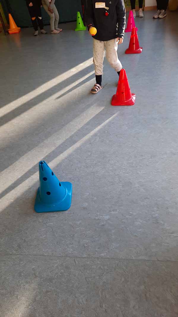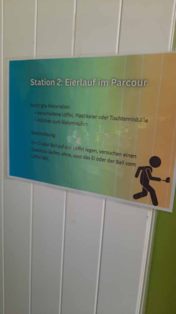 Die Kinder hielten zwei Stäbe in den Händen, zwischen denen ein Ball lag, und versuchten, ihn beim Laufen auf verschiedenen Ebenen nicht fallen zu lassen. Diese Station förderte die Feinmotorik und den Gleichgewichtssinn.
