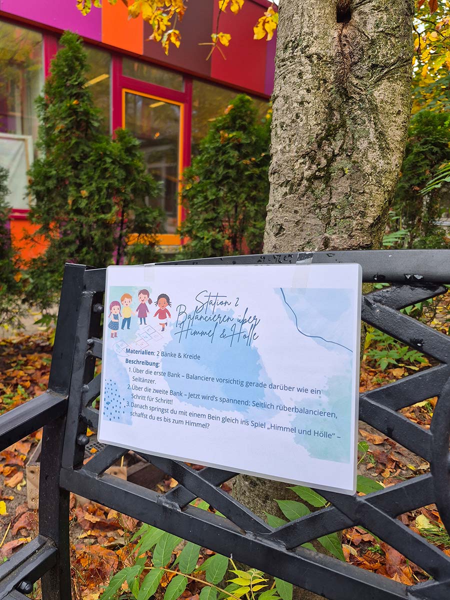 Die Kinder haben hier versucht Ringe auf Hütchen zu werfen. - Station 2: Balancieren über Himmel & Hölle