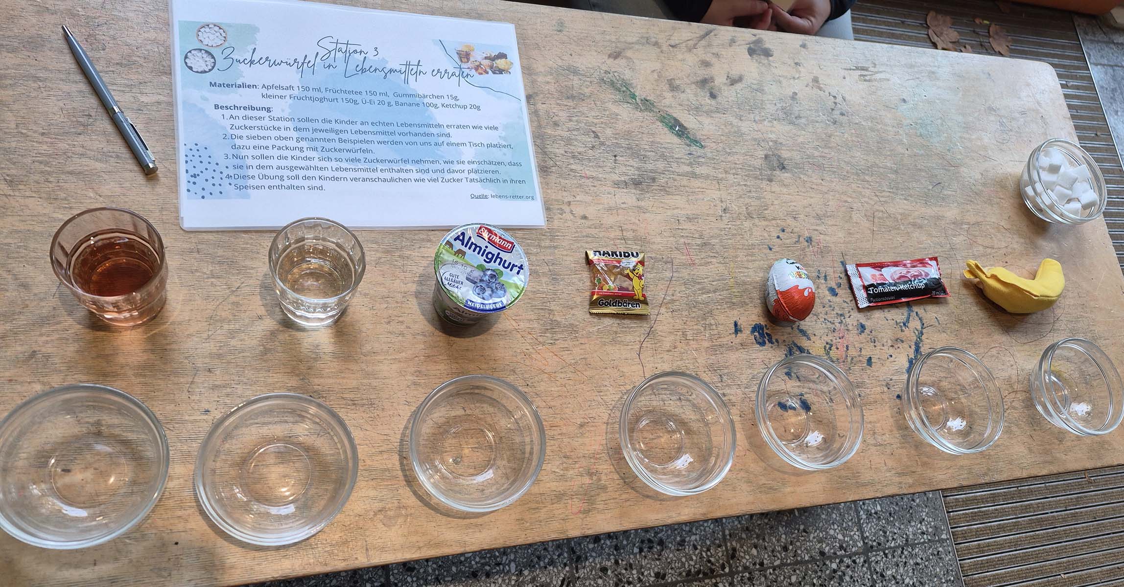 Die Kinder haben versucht den Zuckergehalt in verschiedenen Lebensmitteln zu erraten. - Station 4: Dinge in den Fühlboxen ertasten