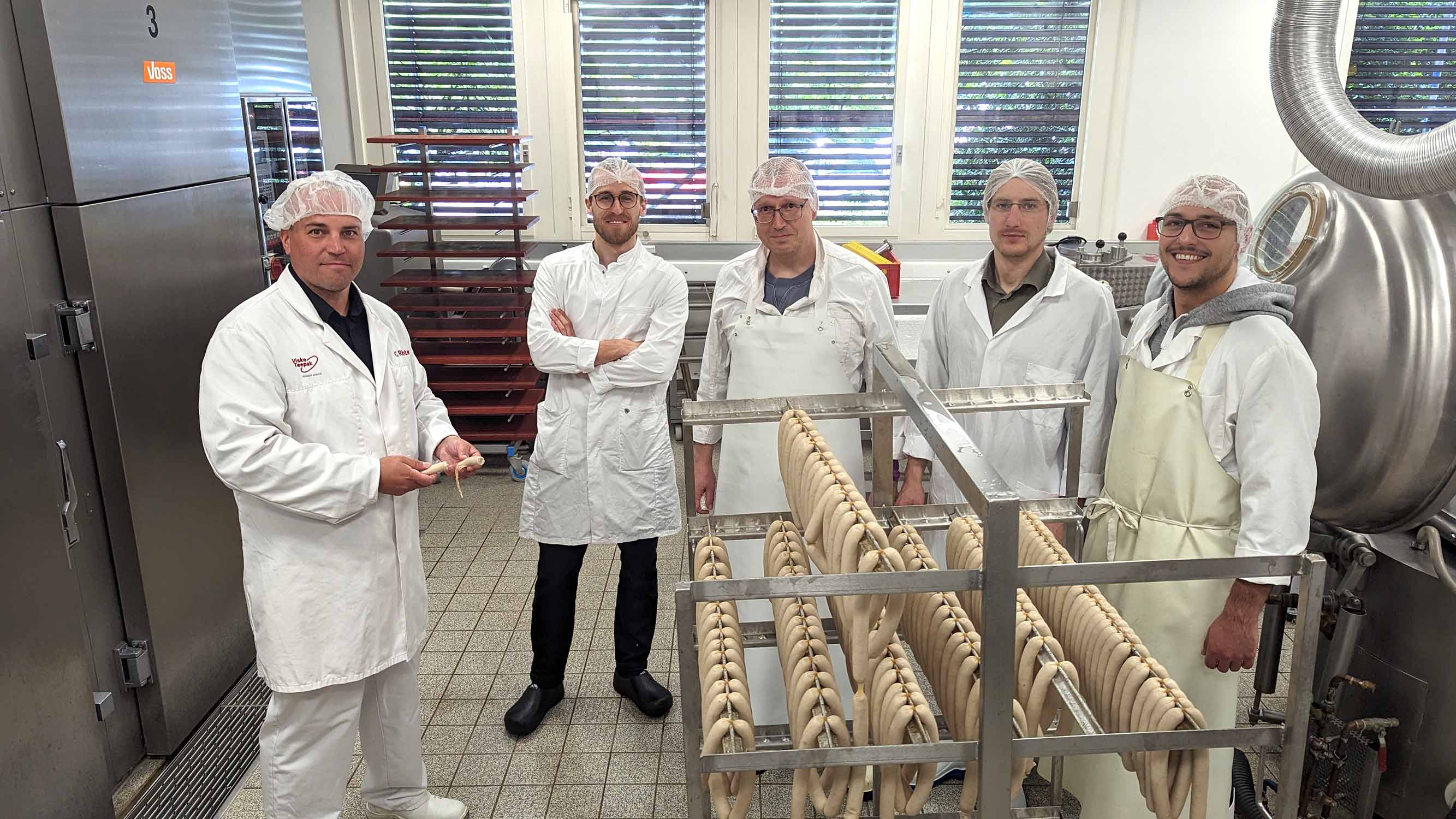 Im Rahmen der Fahrtenwochen besuchte die Klasse OG33 die Fleischerei der Emil-Fischer-Schule, um einen kleinen Einblick in das spannende Handwerk der Wurstproduktion zu bekommen. Zusammen mit den Fleischern im zweiten Lehrjahr aus der DFL21 lag das Augenmerk vor allem auf der Herstellung verschiedener Brühwurstsorten.