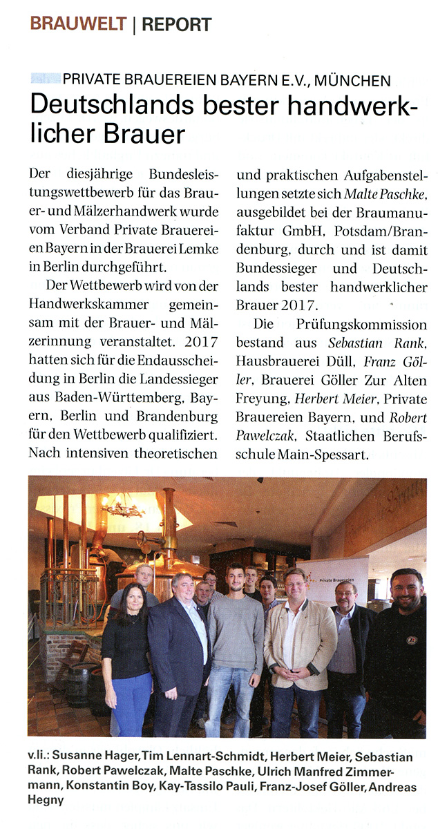 Zum zweiten Mal gibt es einen Bundessieger aus den Brauerklassen der Emil-Fischer-Schule. Diesmal ist es Malte Paschke von der Braumanufaktur Forsthaus Templin. Im Sommer 2017 hat er seine Abschlussprüfung als Bester bestanden und im Anschluss daran den bundesweiten Leistungswettbewerb gewonnen. Wir gratulieren!