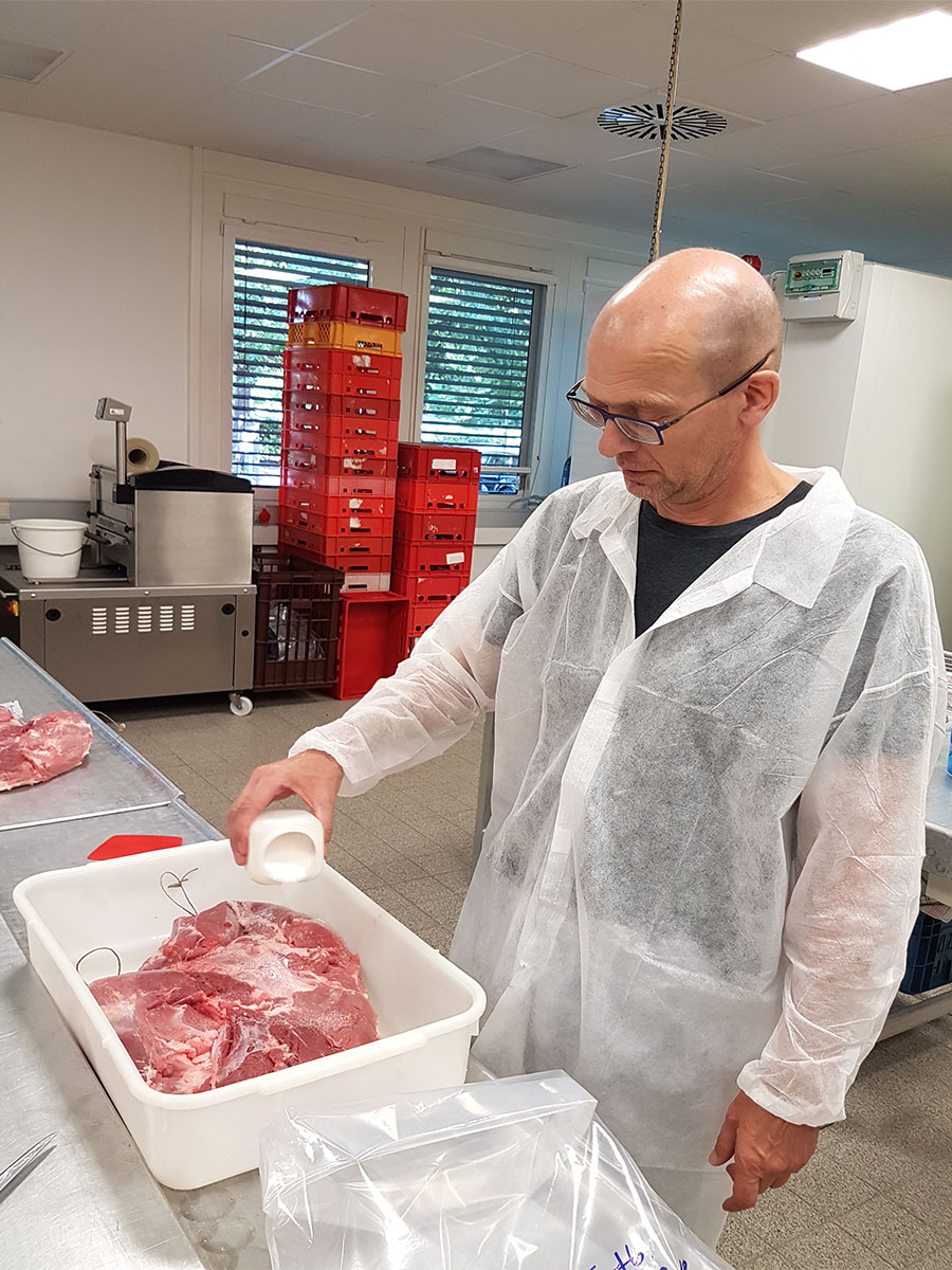 Die Ergebnisse der Zerlegung und Verarbeitung der frischen Schweinekeulen werden in den nächsten Wochen im Verkauf im Hause zu sehen sein.