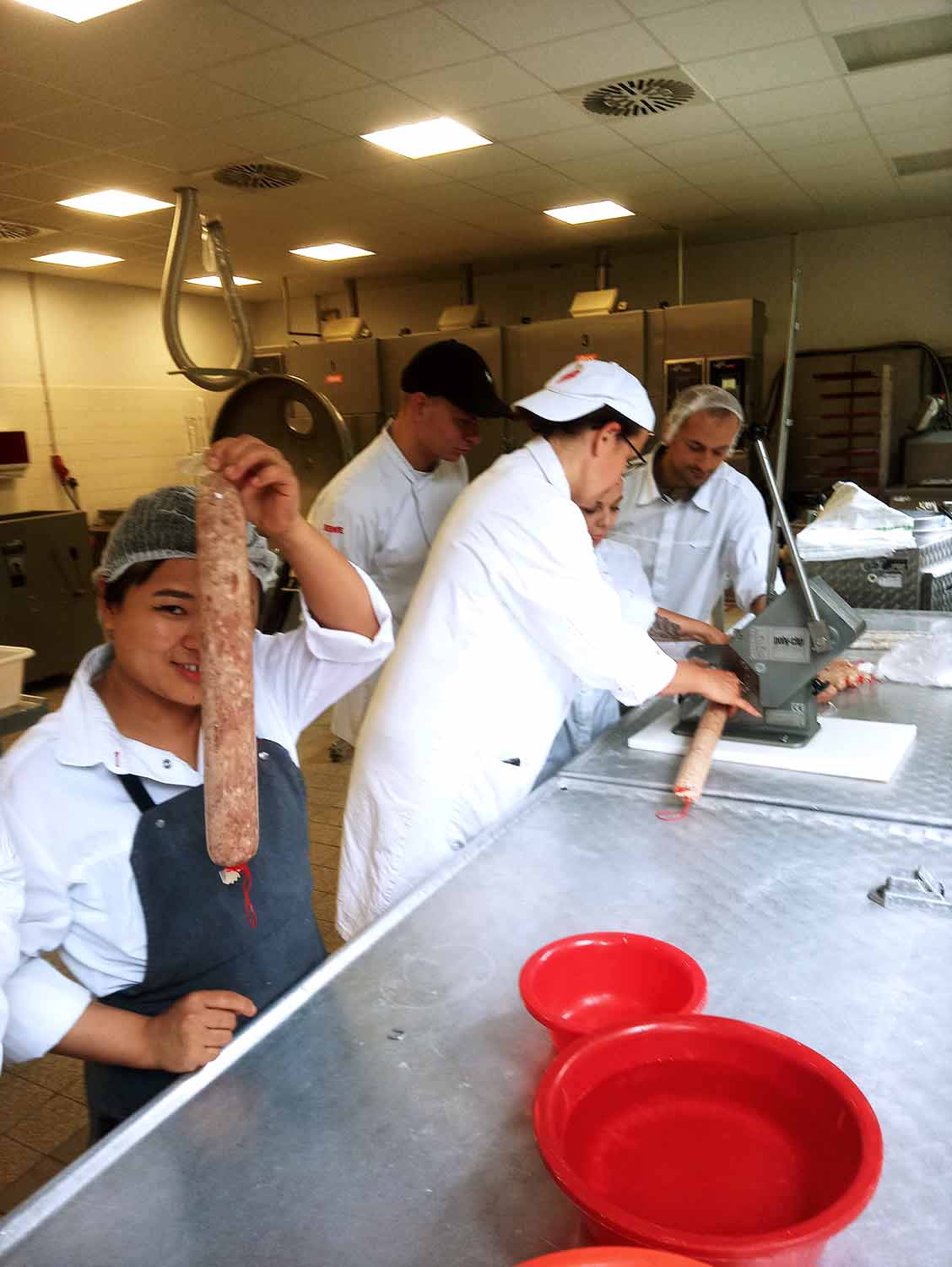 Die Rohwurst „Salami mit Fenchel“ wurde erst gewolft und anschließend in einem Menger gemengt, um sie dann zu füllen. Die zweite Wurst „Sesam-Bratwurst“ aus der Kategorie Brühwürstchen ist eine weiße Ware. Als Fetteinlage wird hochwertiges Sesamöl verwendet, welches den Geschmack so besonders macht. Hier lernten die Schüler und Schülerinnen das Kuttern nach dem „Magerbrätverfahren“ kennen.